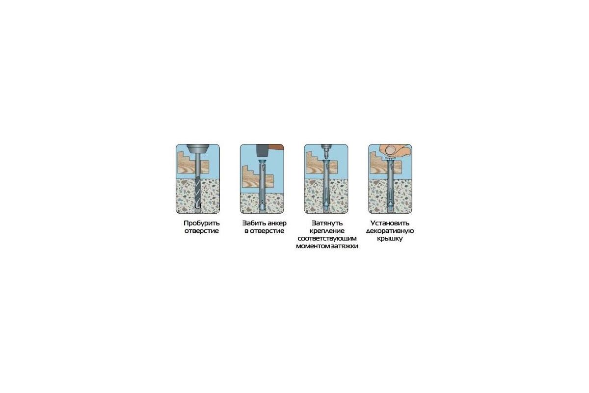 - Анкер устанавливается в предварительно просверленное и очищенное от буровой муки отверстие, расклинивание происходит при закручивании винта.