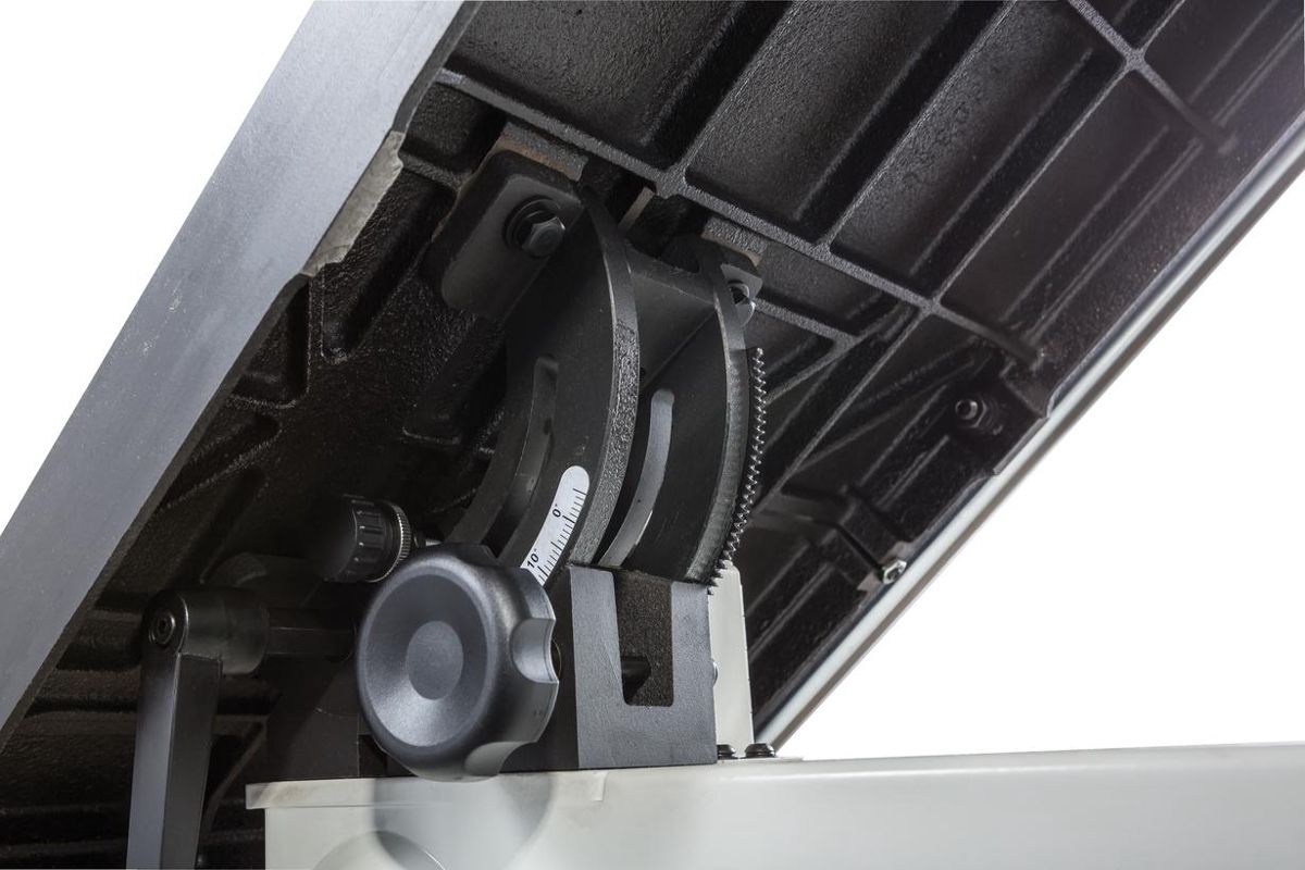 - Регулировка наклона пильного стола вращением рукоятки;