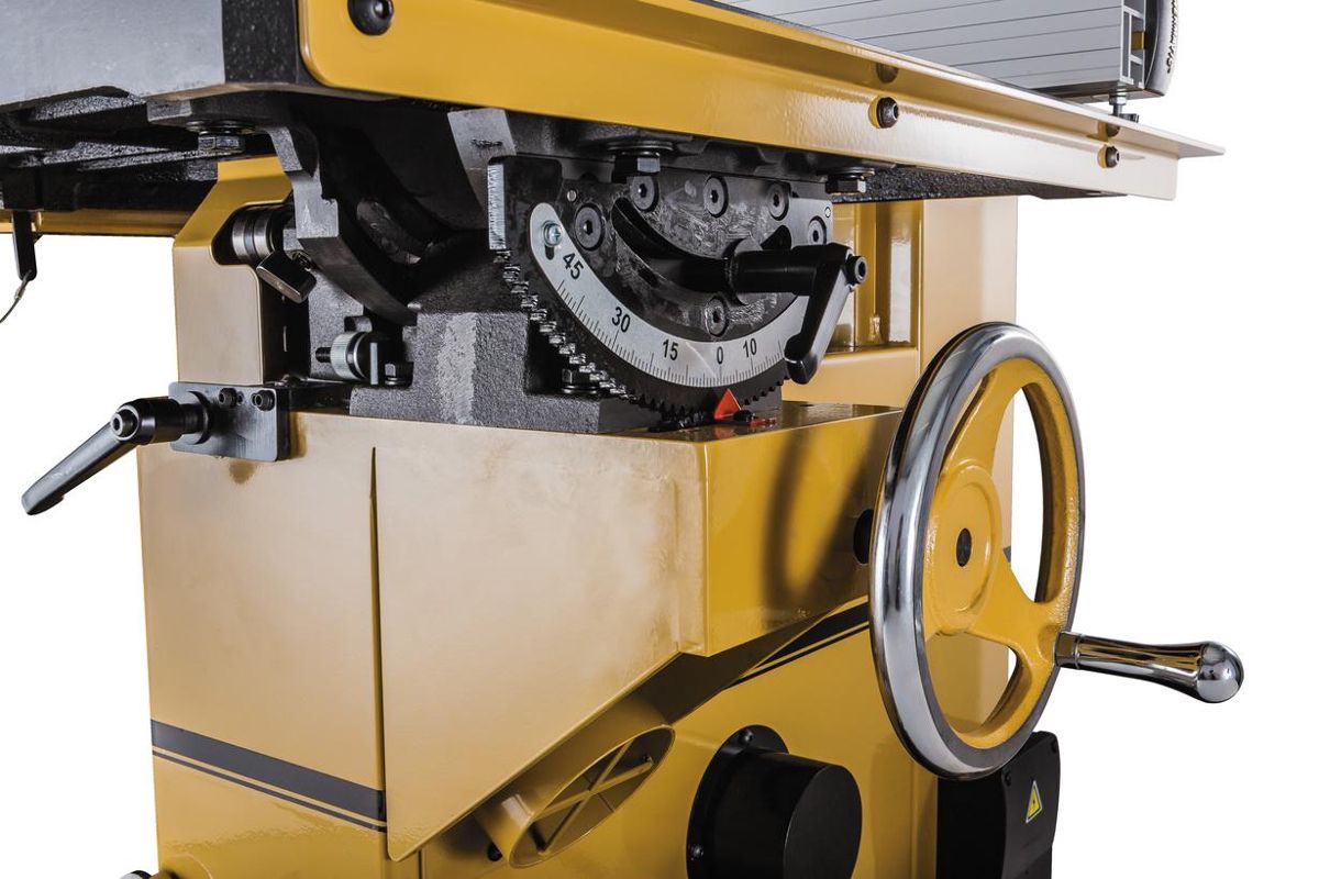 - Наклонный механизм стола имеет кроме фиксатора и транспортирной шкалы зубчатый привод от маховика;