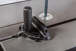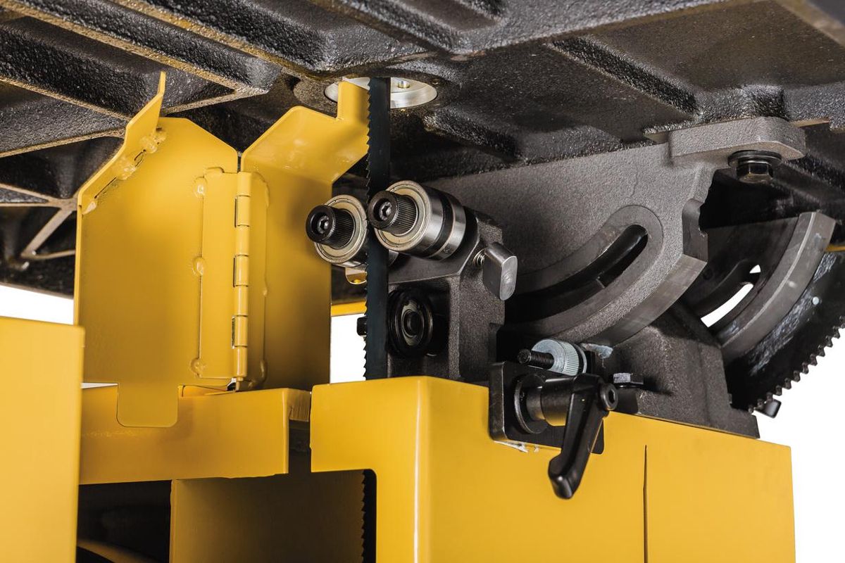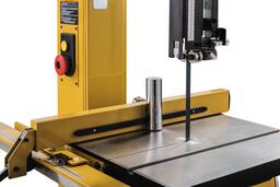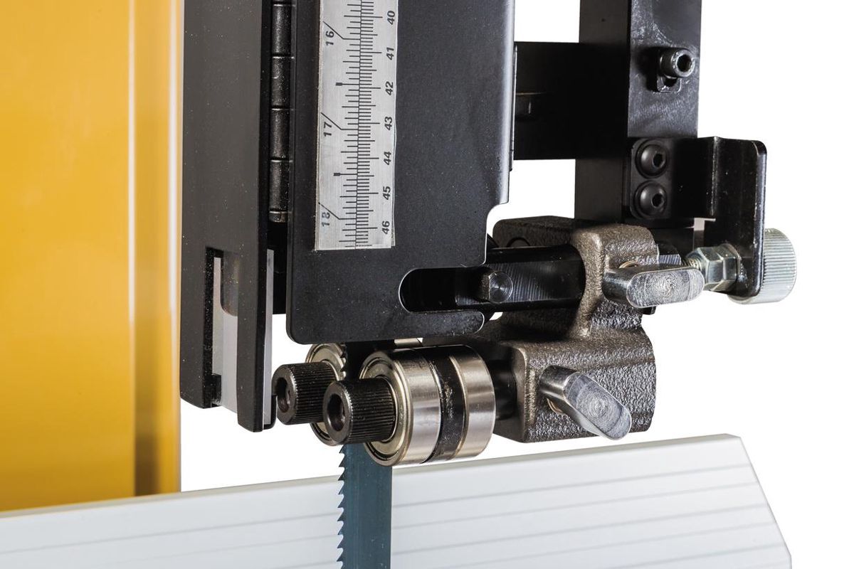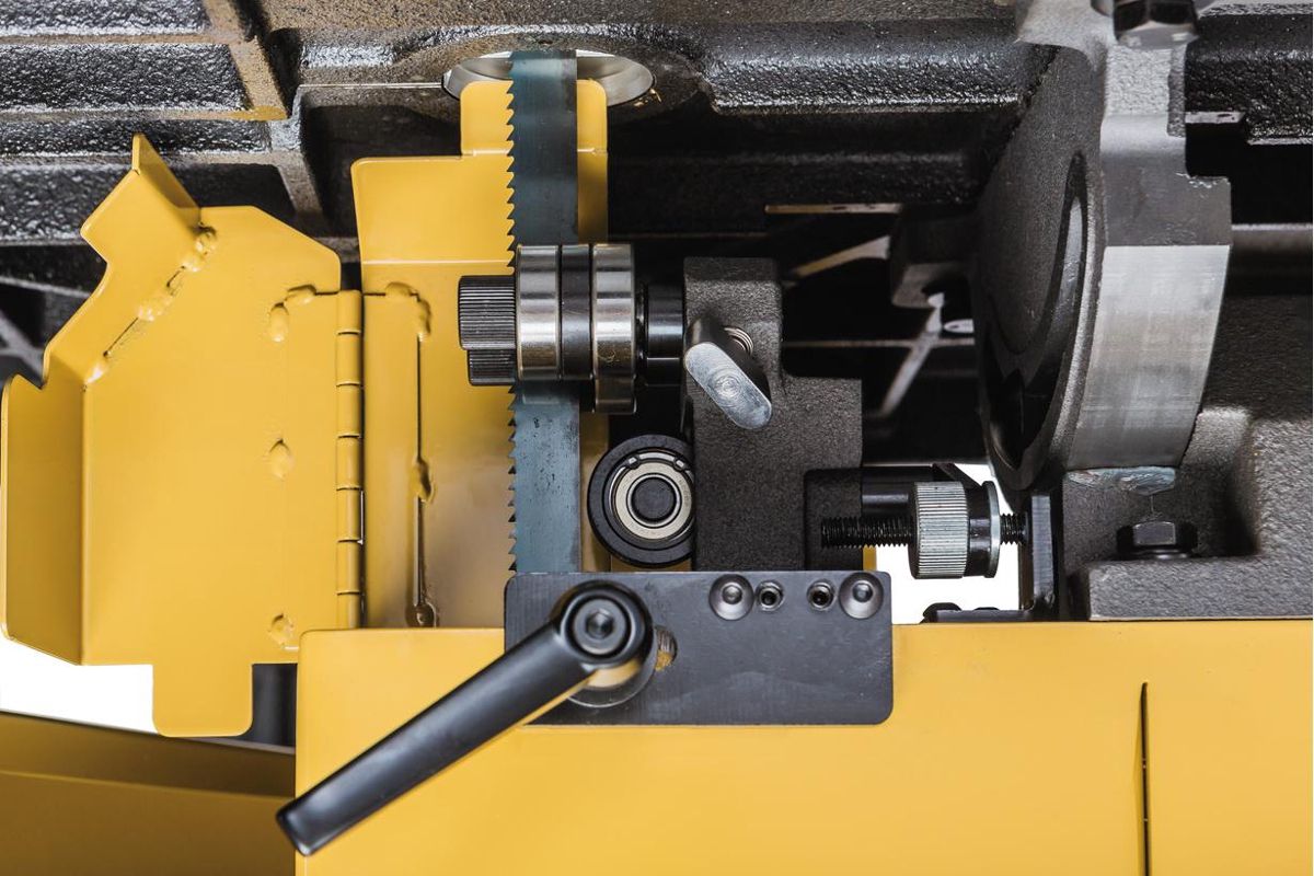 - Реечная регулировка верхних направляющих, натяжитель ленты со стрелочным индикатором усилия, рычаг для быстрого ослабления полотна и даже педаль остановки с механическим тормозом выбега шкивов.