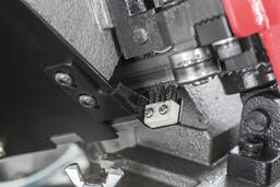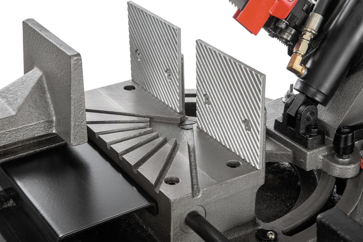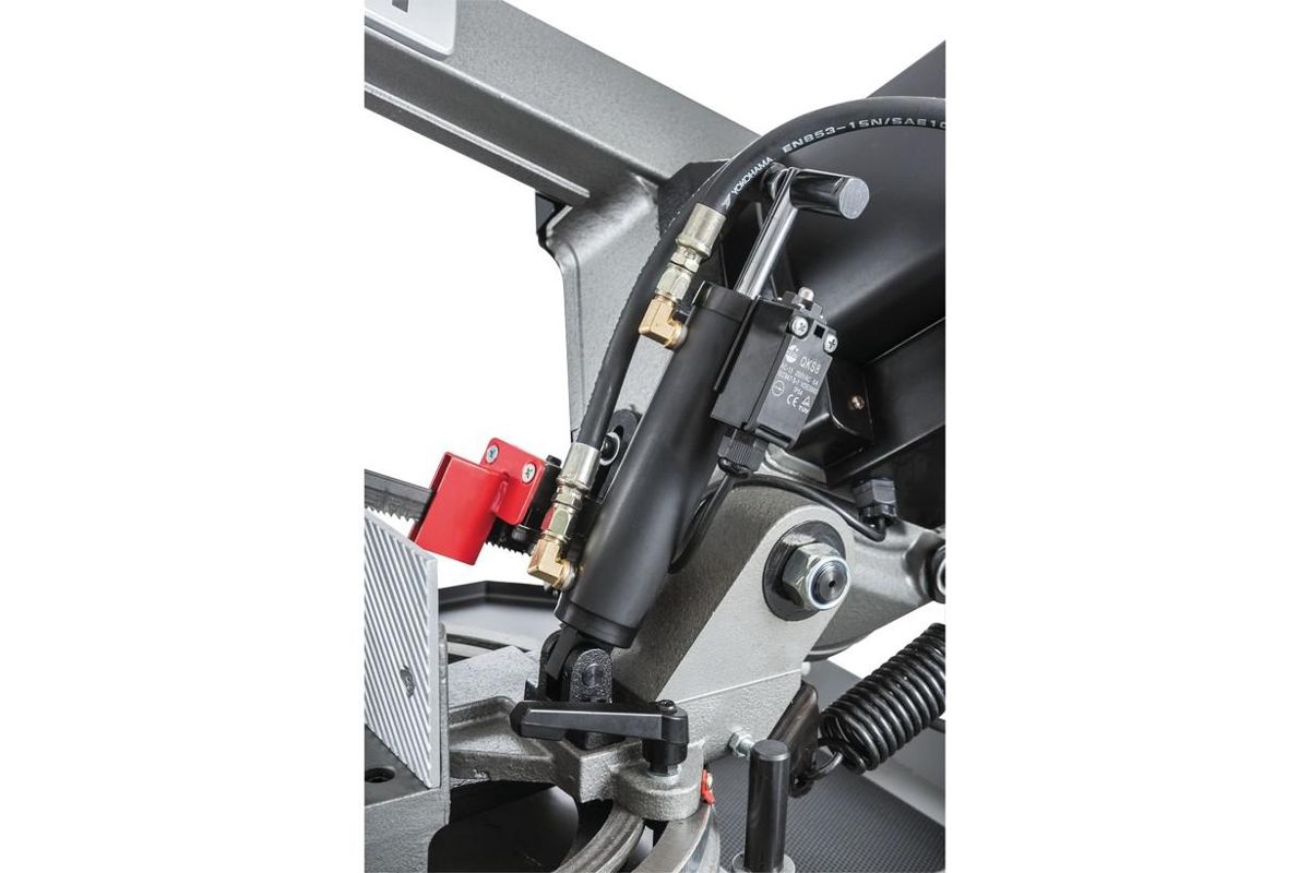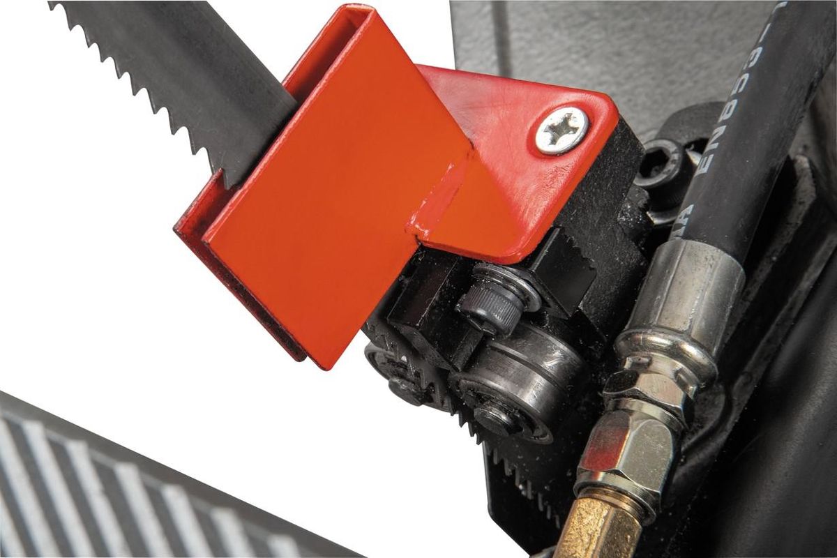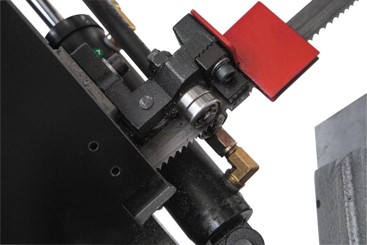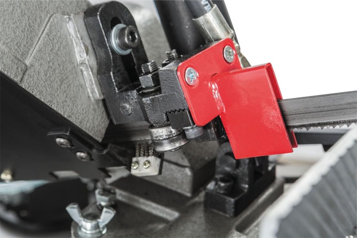 Система подачи СОЖ отлично охлаждает полотно и заготовку, что гарантирует высокое качество реза и повышает стойкость полотна. А щёточка для чистки полотна гарантирует выборку крупной стружки из зубьев полотна.