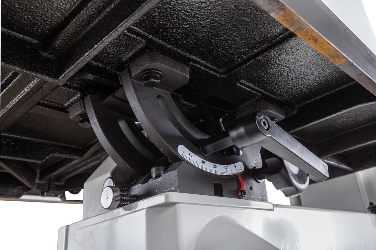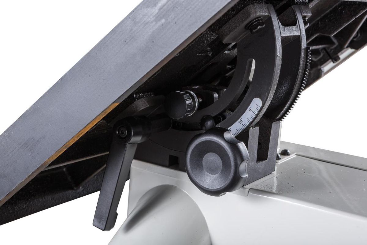 Наклон пильного стола регулируется поворотом рукояти. Максимальный угол наклона – 45°.