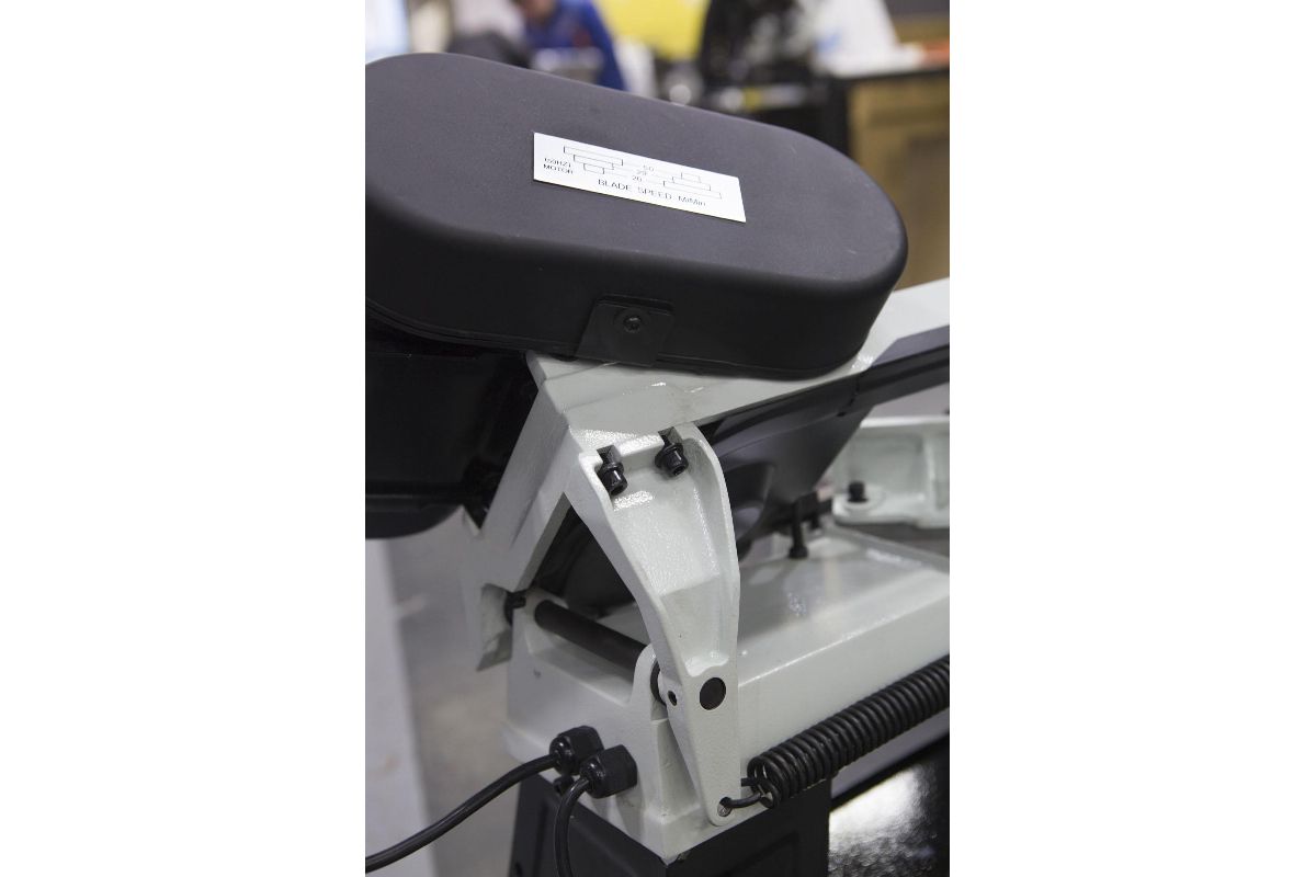 На верхней части корпуса есть рукоятка. Пригодится, чтобы опустить пилу к заготовке.
