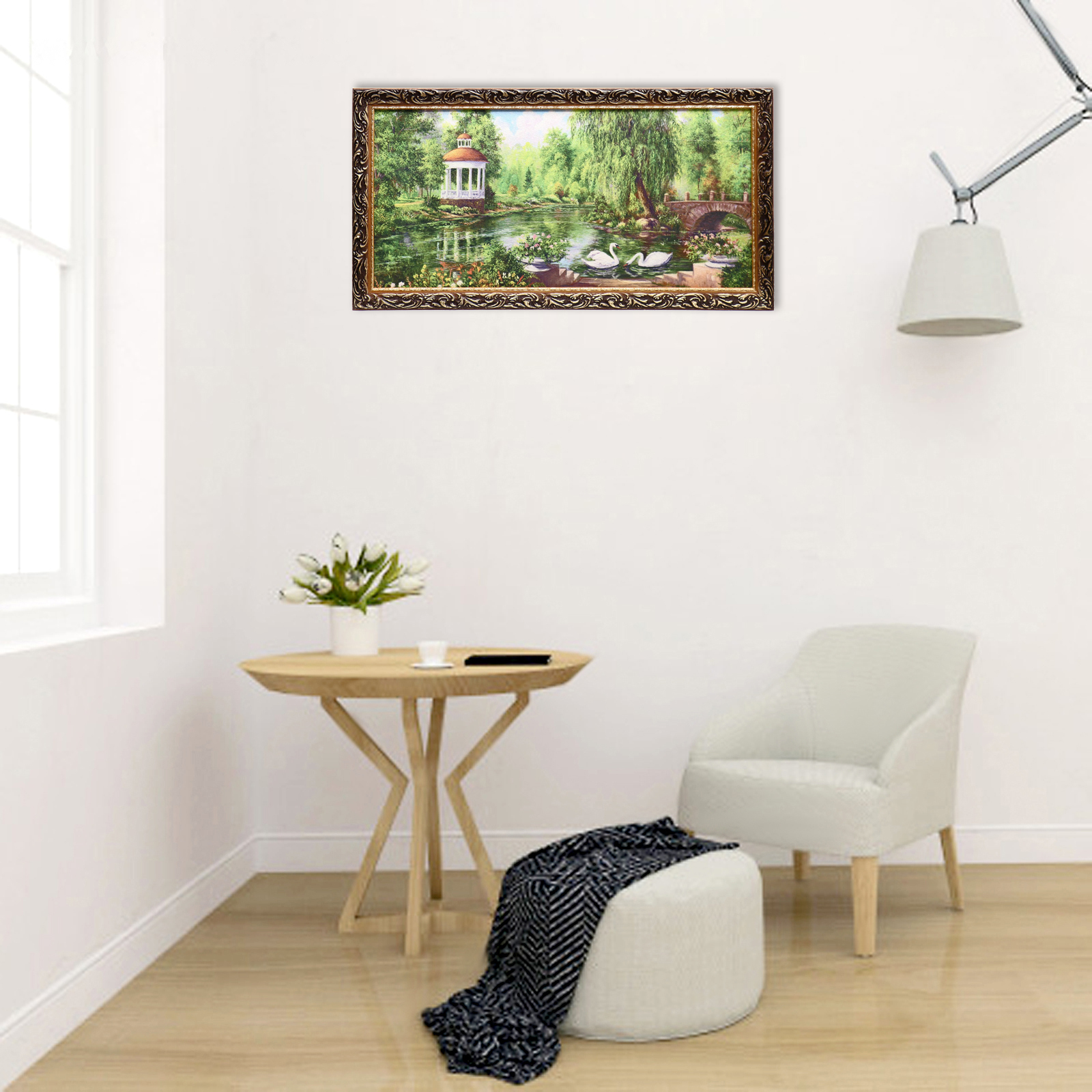 Что может наполнить дом изысканностью и уютом одновременно? С этой задачей изящно справится гобеленовая картина "Лебеди в парке" 45х85 см. Она поражает детализированностью рисунка. Только при близком рассмотрении как будто нарисованное полотно открывает ювелирное переплетение волокон и рельеф благородной ткани.