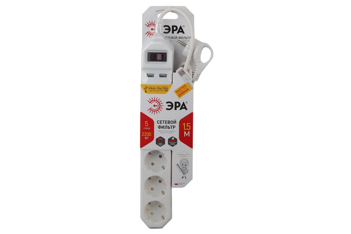 Сетевой фильтр ЭРА белый USF-5es-1.5m-USB-W с заземл 3x0.75мм2 с выкл 5гн+2USB 1.5м