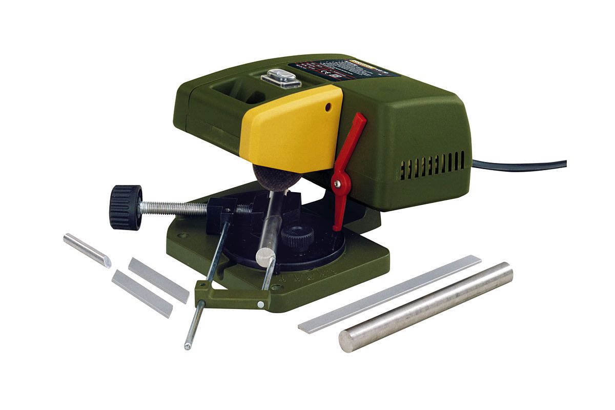 Proxxon KG 50 — отрезная машина мощностью 85 Вт со струбциной в комплекте. Устройство позволяет точно и безопасно резать заготовки из пластика, дерева, стали либо цветных металлов. Отрезной диск изготовлен из специального керамического компаунда, имеет размеры 50x1 мм. Продуманная конструкция зажима не позволяет детали деформироваться или наклоняться в процессе реза.
