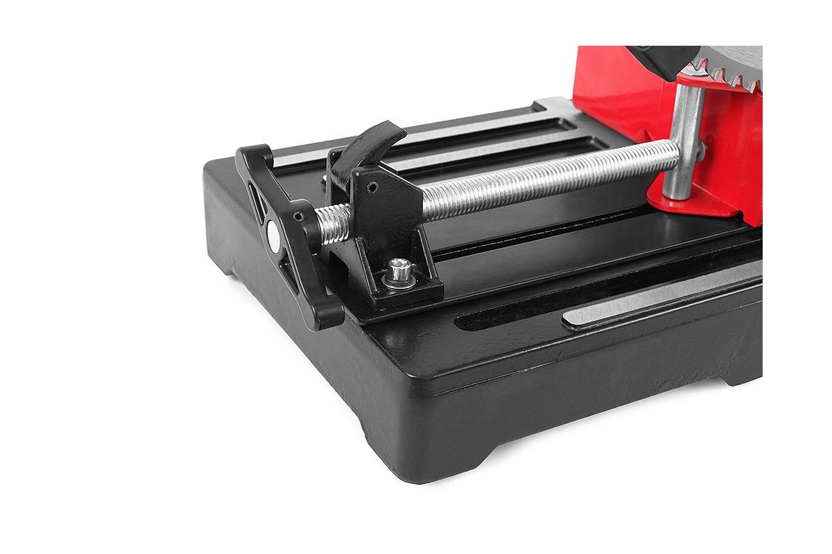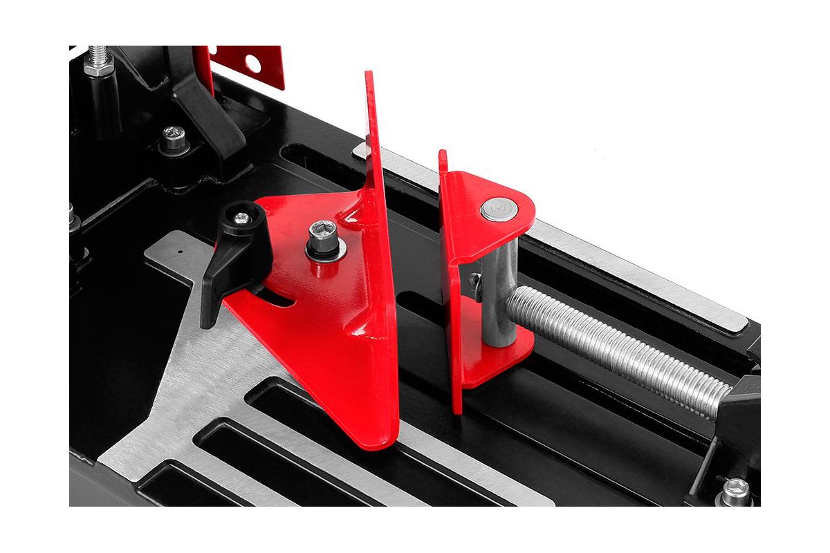 Пила оснащена быстрозажимными тисками, позволяющими резать заготовку под разными углами.
