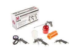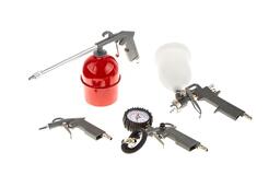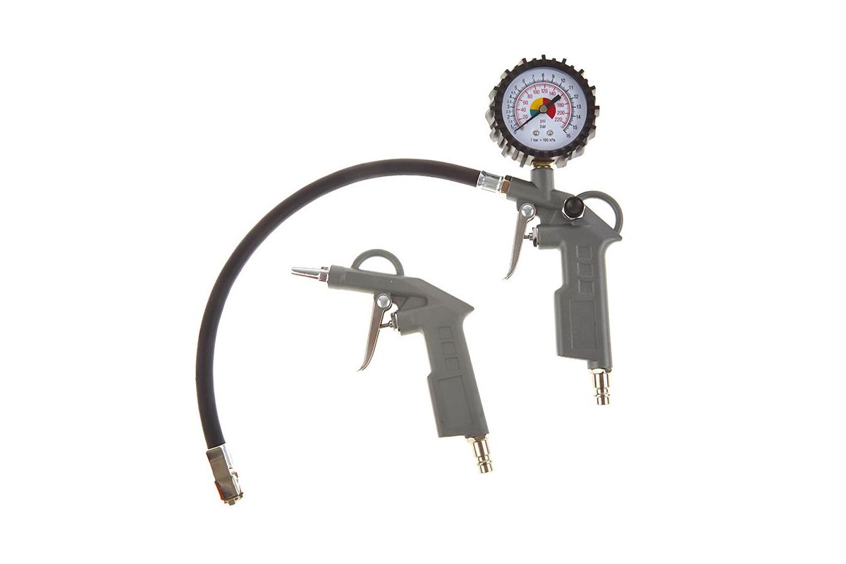 - Набор пневмоинструмента включает в себя 5 предметов. Пневмодвигатели отличаются большим рабочим ресурсом, а также возможностью длительной работы без перегрева. Пистолет для подкачки шин оснащен большим манометром для точного контроля за уровнем давления внутри шин. Корпусы выполнены из металла, что гарантирует надежную защиту внутренних узлов от повреждений при ударах и падениях. Спиральный пневмошланг длиной 5 м обеспечивает стабильную работу инструмента на удалении от питающего компрессора.