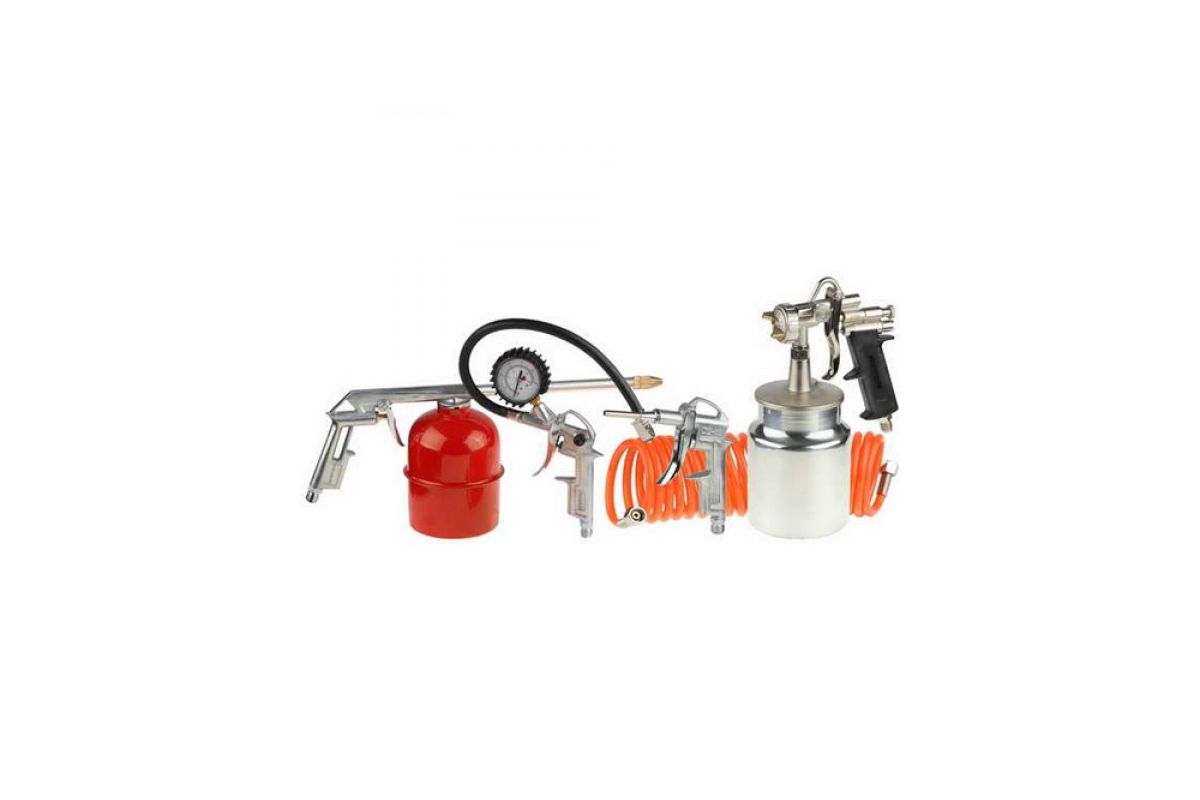 Основные характеристики - 5 предметов: краскораспылитель с нижним бачком, пистолет для нанесения защитных покрытий, продувочный писолет,пистолет для подкачки шин, пневмошланг