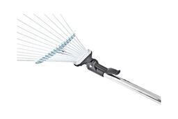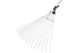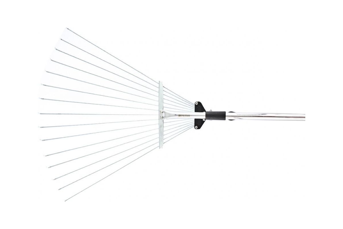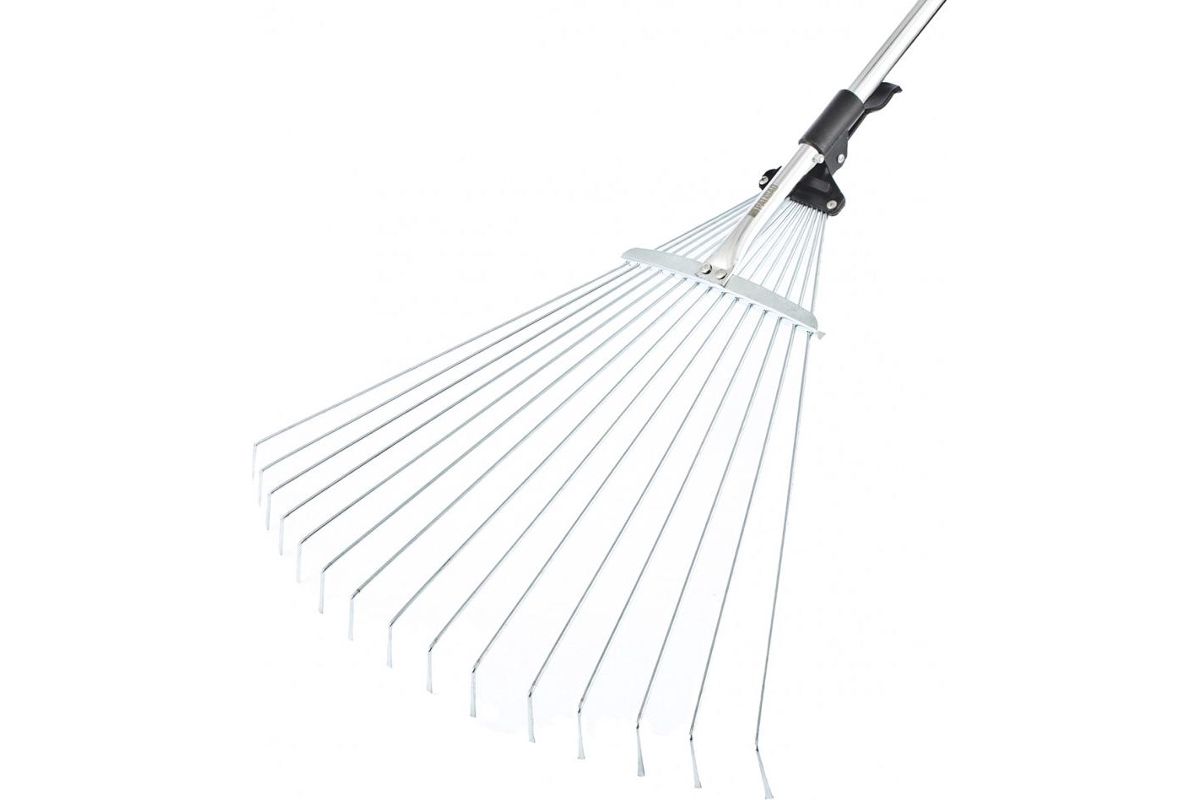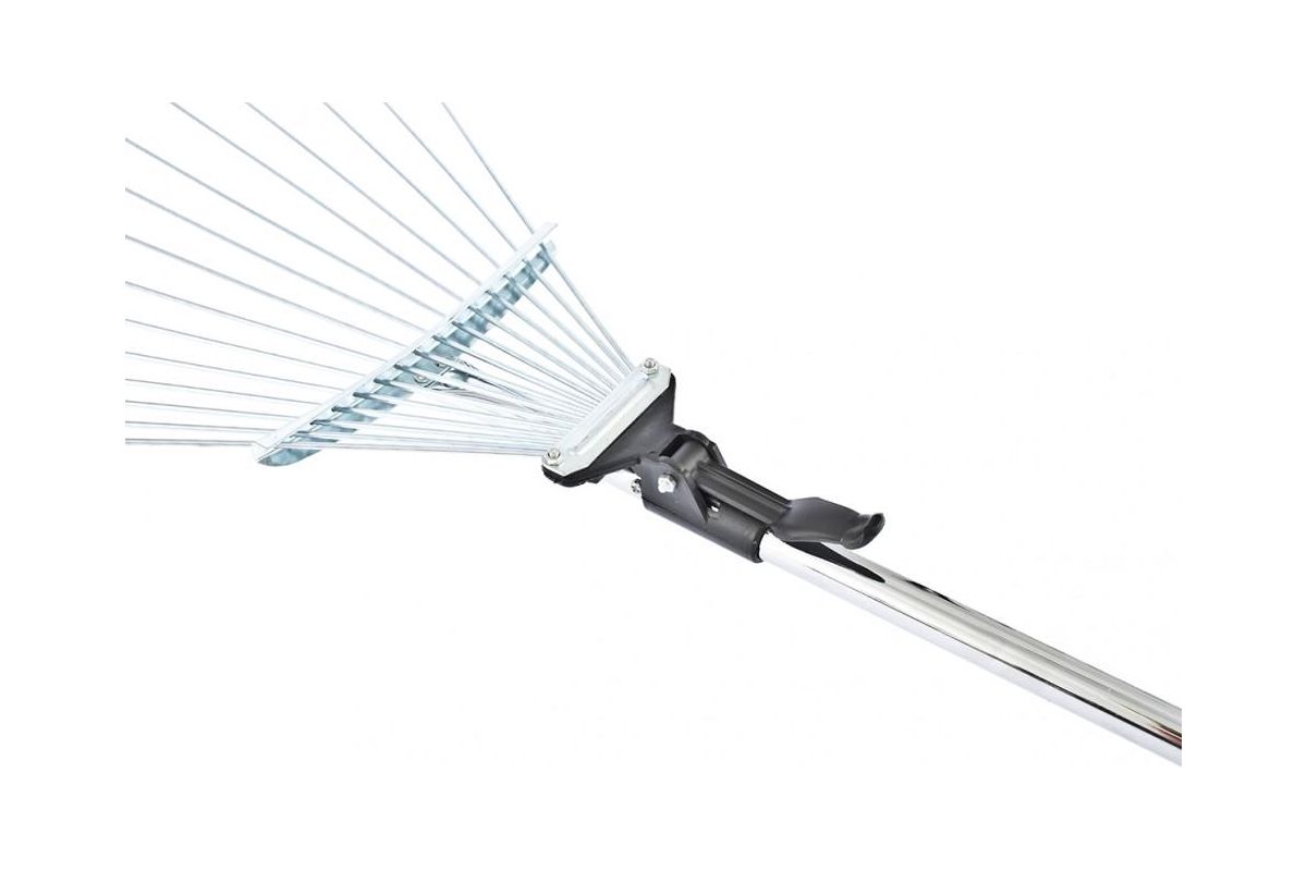 Грабли веерные регулируемые, 15 круглых, сплющенных на концах зубьв, охват рабочей части от 200 до 440 мм. Алюминиевый черенок длиной 1600 мм с резиновой ручкой на конце. Зубья закреплены на подвижной, скользящей по черенку втулке, которая фиксируется эксцентриковым зажимом в любом необходимом положении, изменяя ширину захвата.