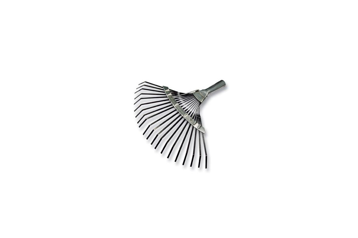 Грабли веерные усиленные, 20 плоских зубьев, охват рабочей части 400 мм. Тулейка внутренним диаметром 25 мм. Расположенная сверху распорка усиливает пружинящий эффект и дополнительно упрочняет конструкцию.