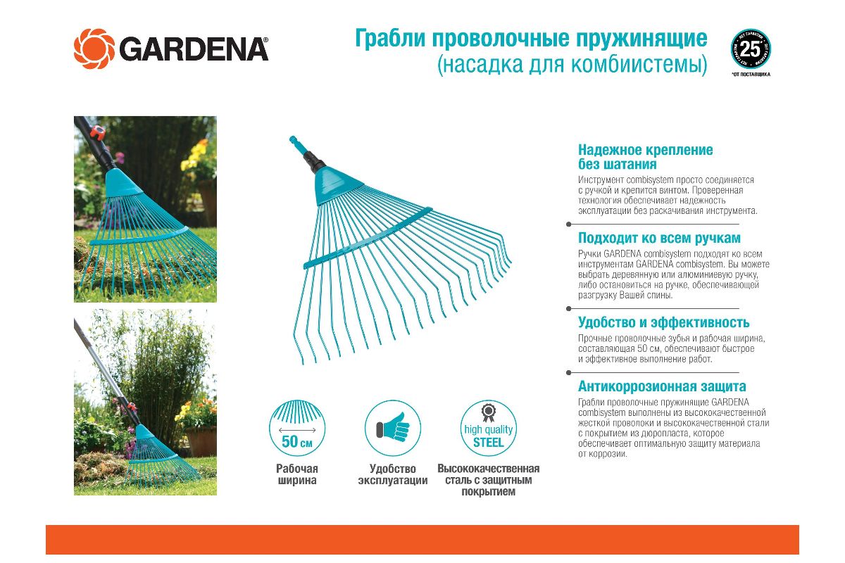 Грабли проволочные пружинящие GARDENA combisystem представляют собой идеальный инструмент для очистки и аэрации заболоченных участков газона. Прочные проволочные зубья и большая рабочая ширина (50 см) обеспечивают быстрое и эффективное выполнение работы. Грабли могут использоваться с любой ручкой GARDENA combisystem, однако компания GARDENA рекомендует использовать ручку длиной 130 см, в зависимости от роста пользователя. Гарантия 25 лет.