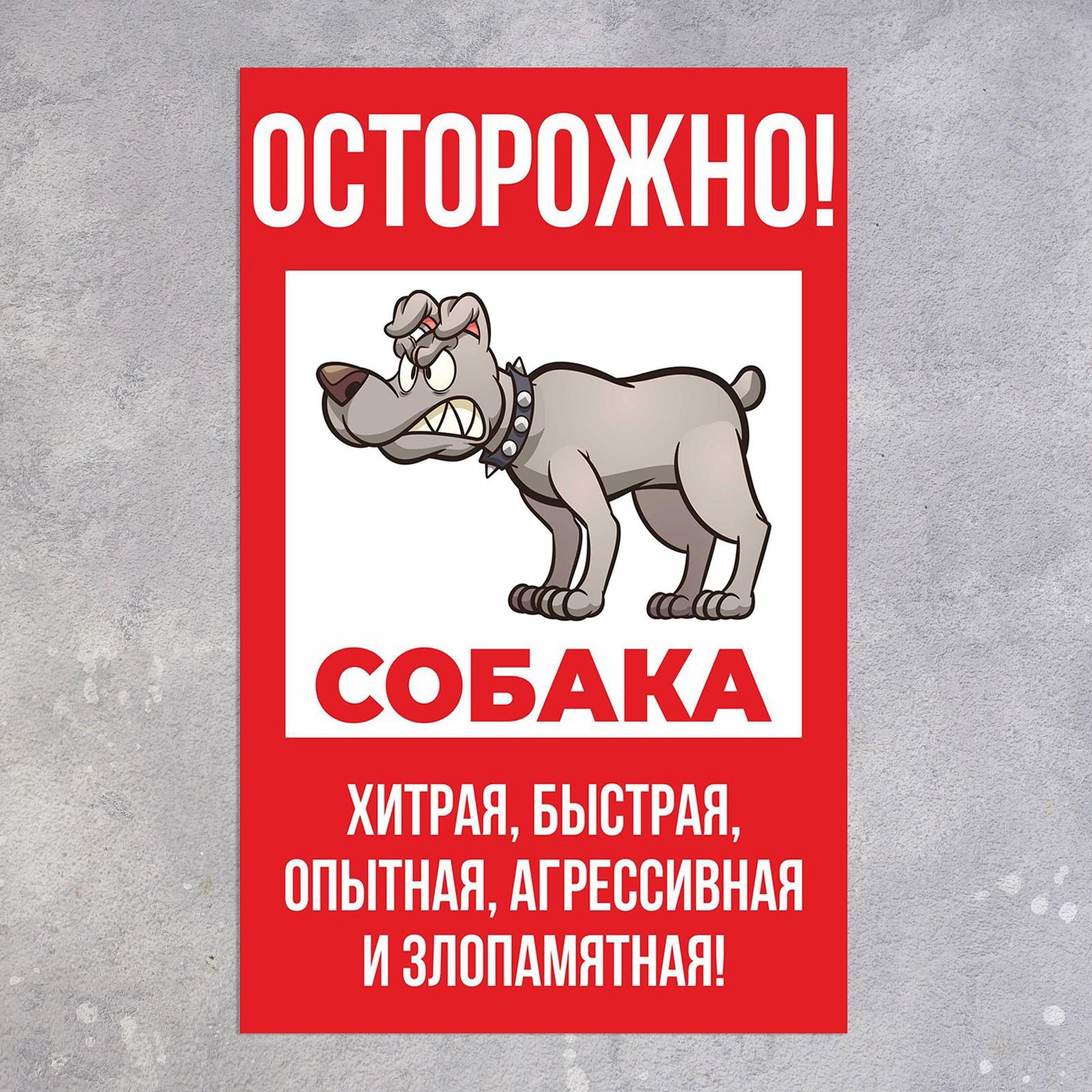 Табличка "Осторожно собака" хитрая 200х300, клейкая основа, цвет красно-белый