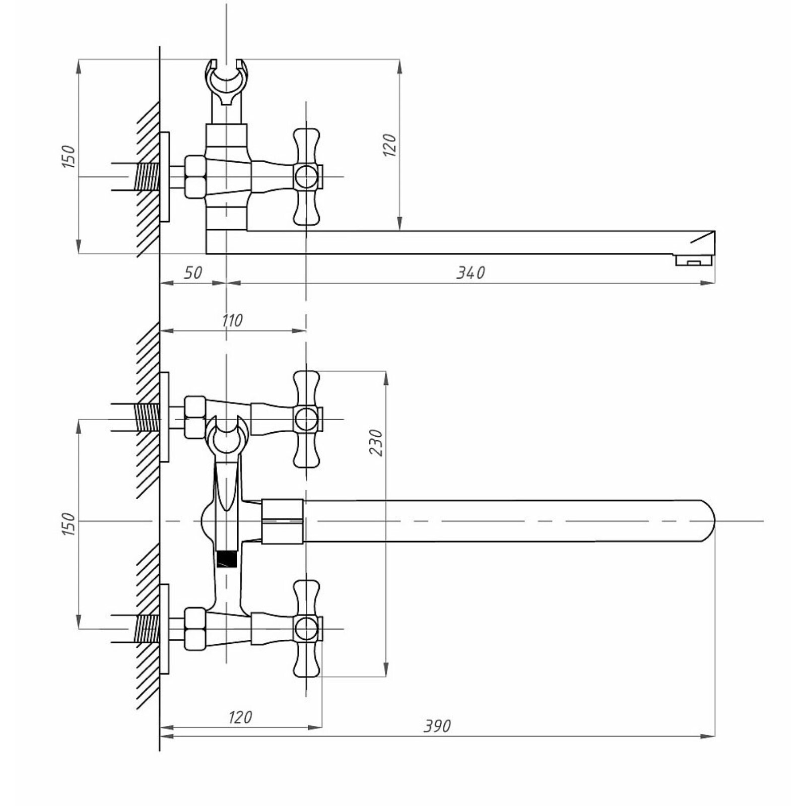 Смеситель для ванны "ПСМ-Профсан" PSM-159-75, двухвентильный, душевой набор, хром