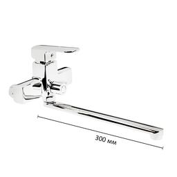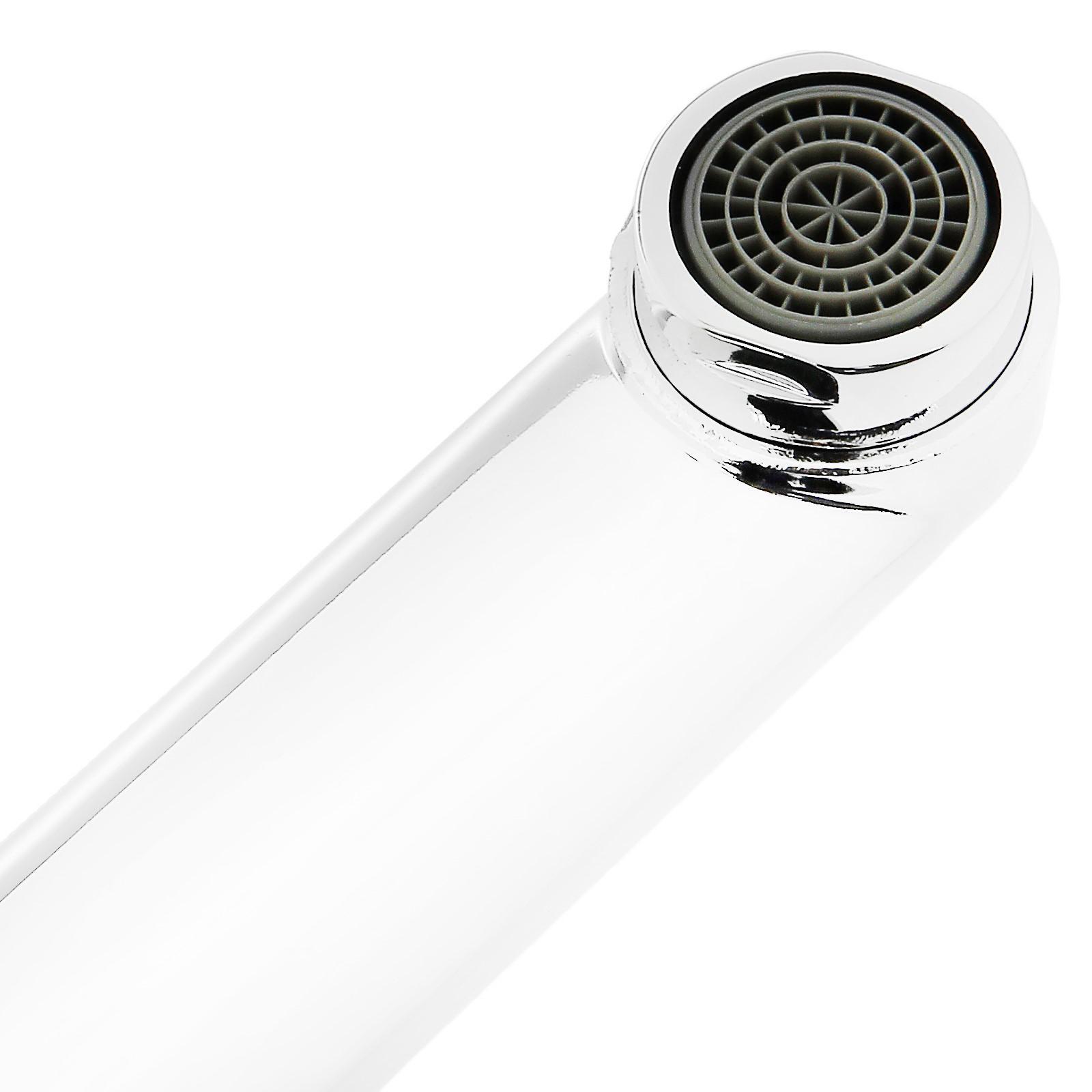 Имеет поворотный длинный излив с одной ручкой, керамический картридж, аэратор, поворотный дивертор в корпусе.
