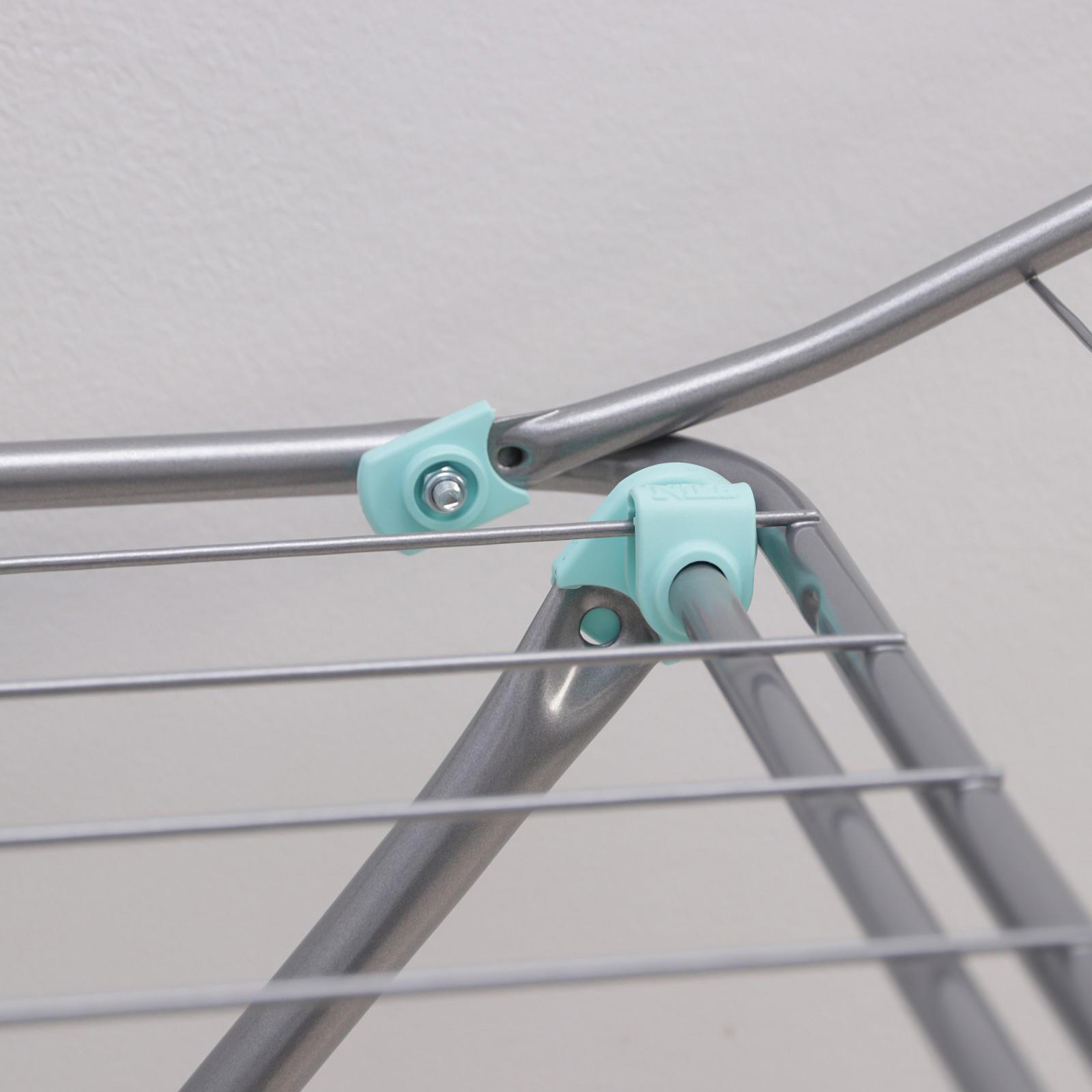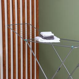 Сушилка легко и аккуратно складывается, не занимая много места при хранении. Общая длина реек 20 метров — хватит на большую стирку! Оптимальная высота 95 см позволяет комфортно развесить вещи, не нагибаясь. Нейтральная расцветка не будет бросаться в глаза, и сушилка отлично впишется в любой интерьер. Изделие выдерживает до 17 кг.