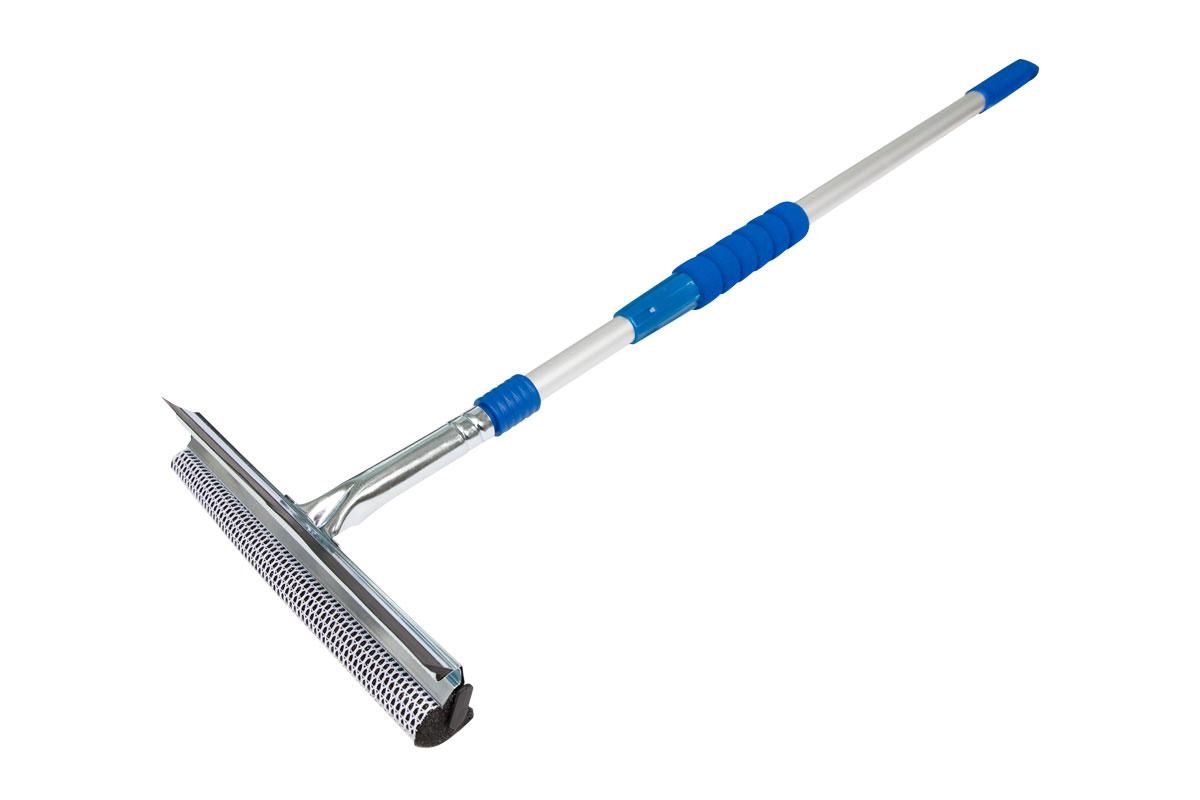 Щетка для мытья имеет телескопическую длинную ручку и рабочую поверхность с поролоном и водосгоном.