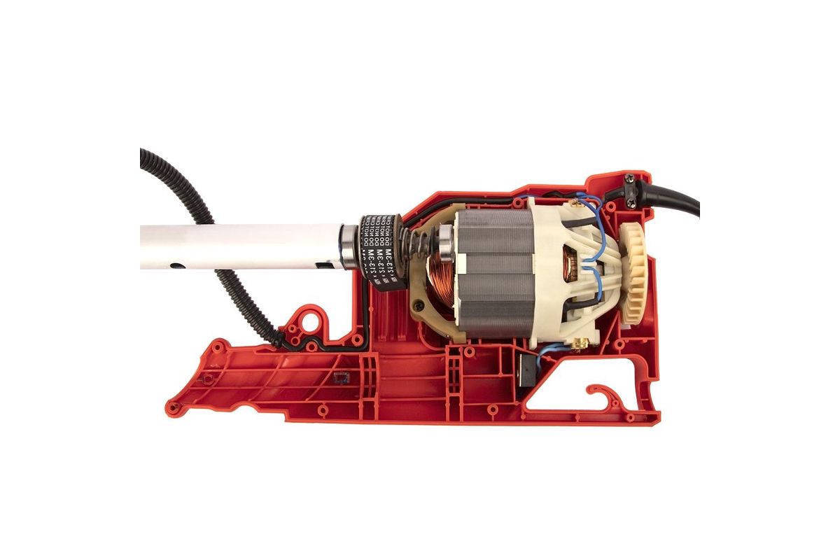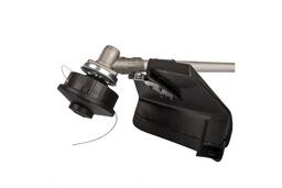 - Защитный кожух уберегает оператора от вращающейся лески и летящих частиц.