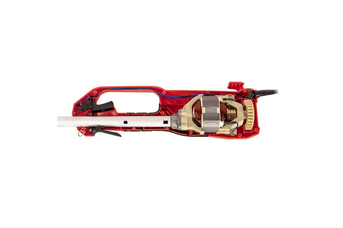 - Защитный кожух уберегает оператора от вращающейся лески и летящих частиц.