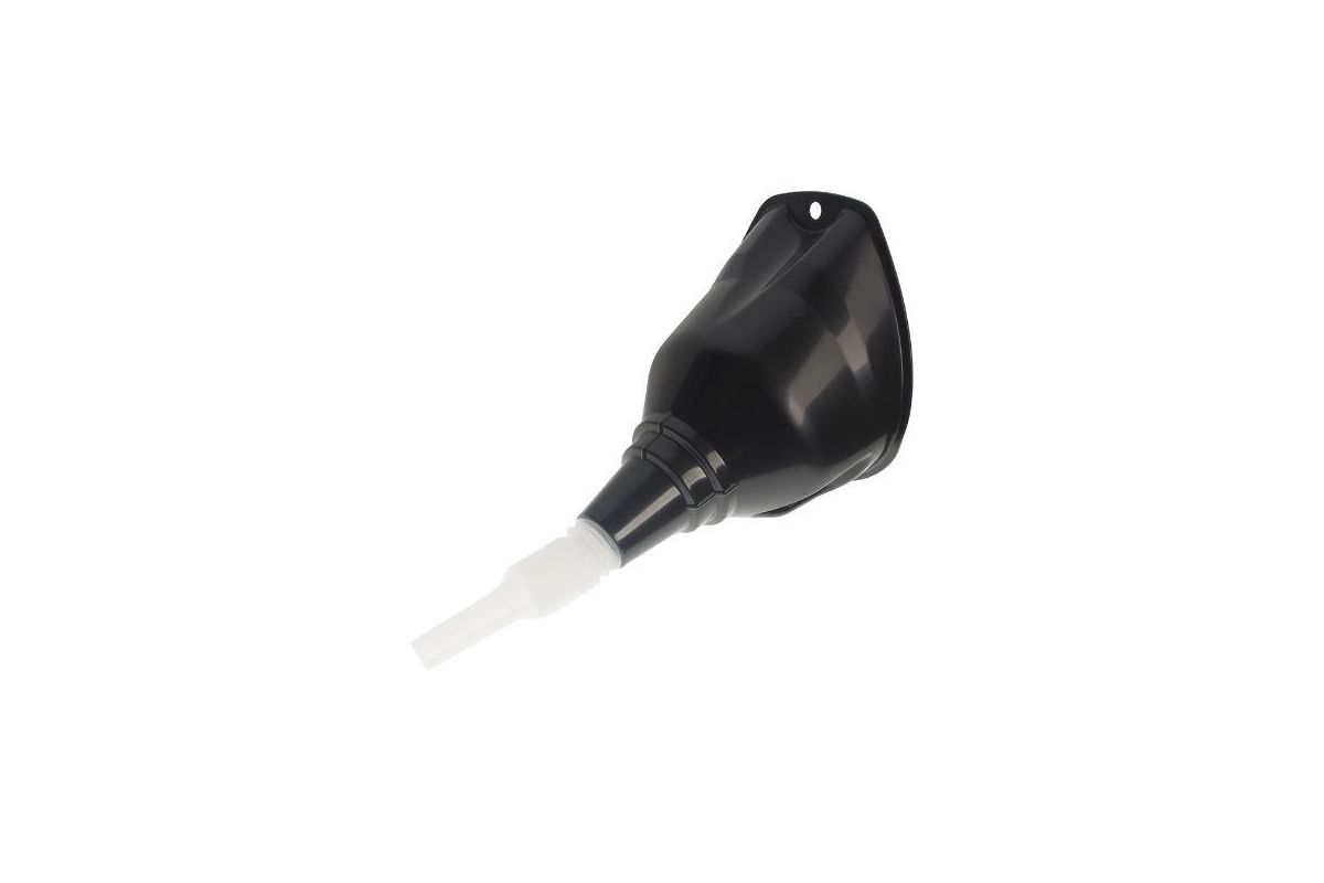 Пластиковая воронка для масла с регулируемым изливом оснащена дополнительным мягким шлангом, который можно отрегулировать в зависимости от типа емкости.