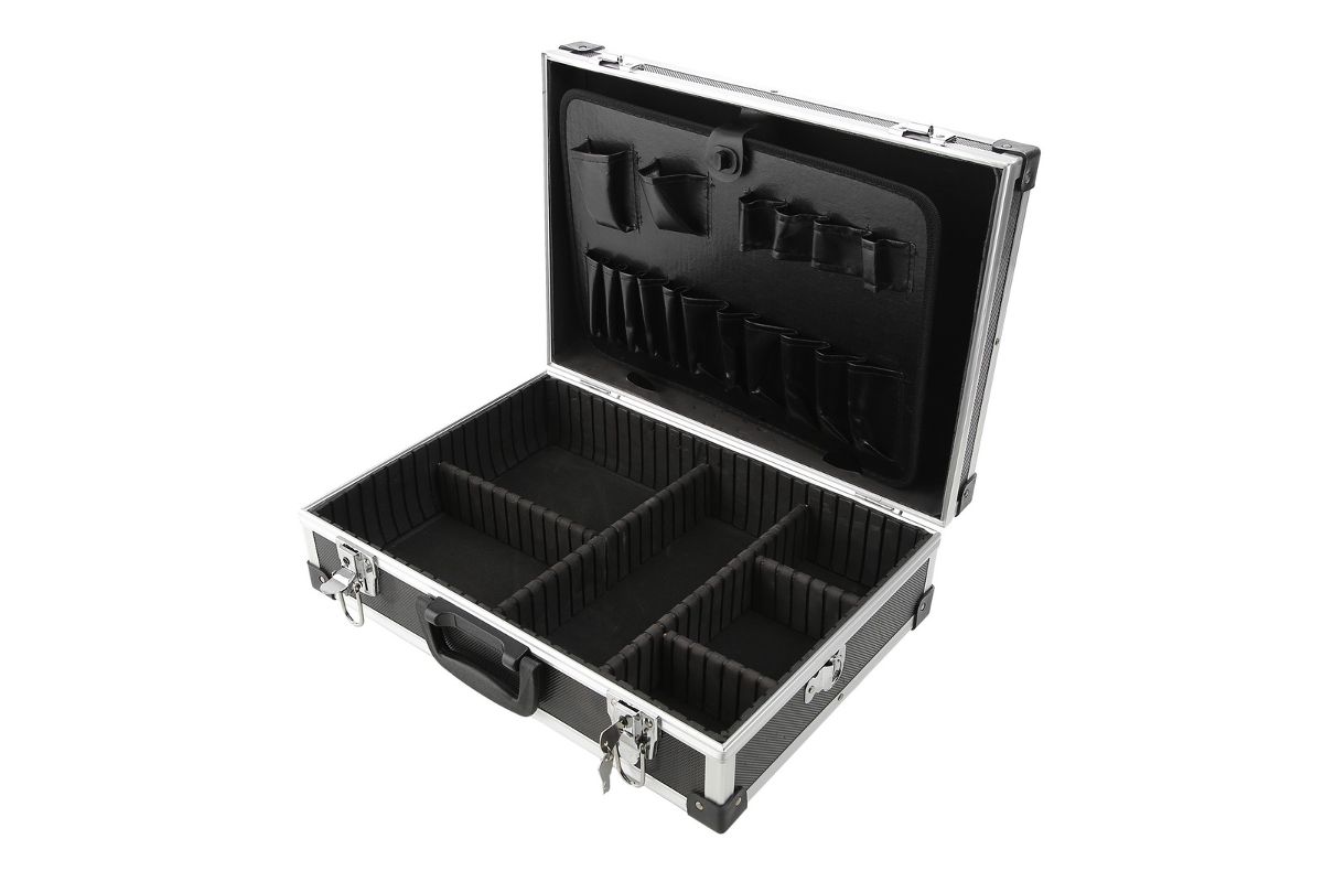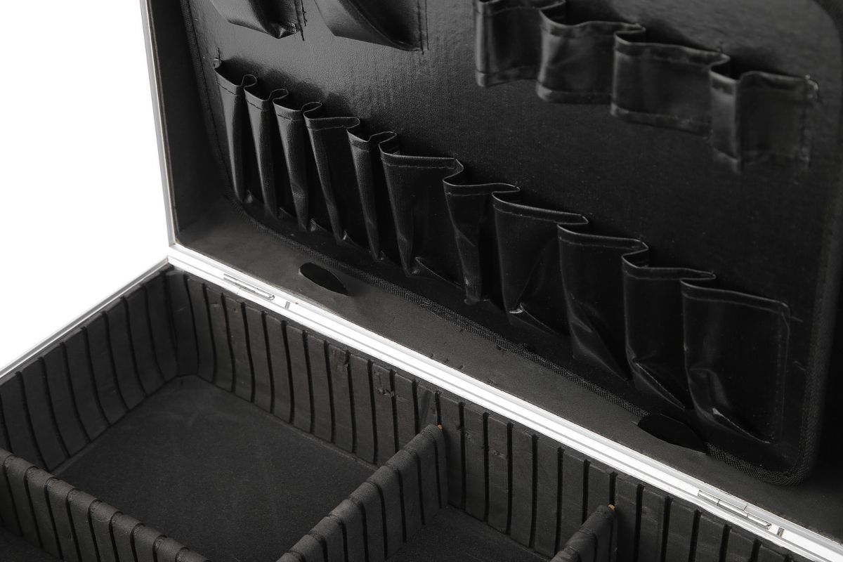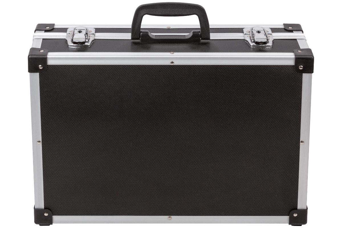 Алюминиевый ящик FIT 65630 — это надежное место для хранения ручного инструмента и его транспортировки. Внутри кейса мягкое покрытие, которое защищает содержимое от царапин. Внутреннее пространство состоит из 6 больших отделений в одной половине (крышке) ящика и 17 маленьких отделений в откидной части.