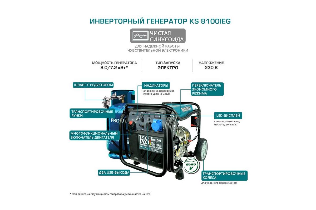 При работе на газу мощность генератора уменьшается на 10%.