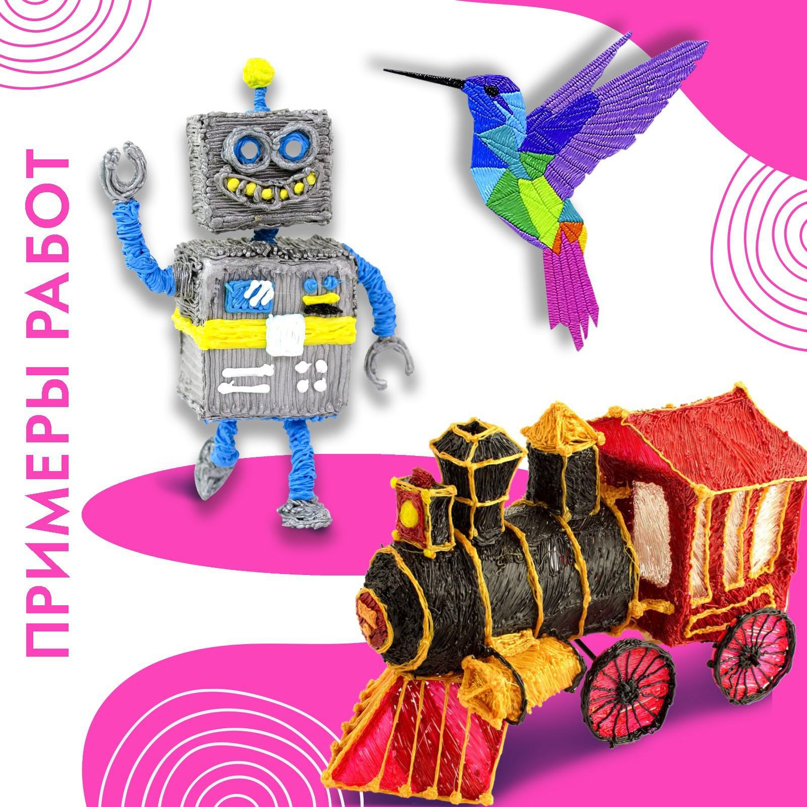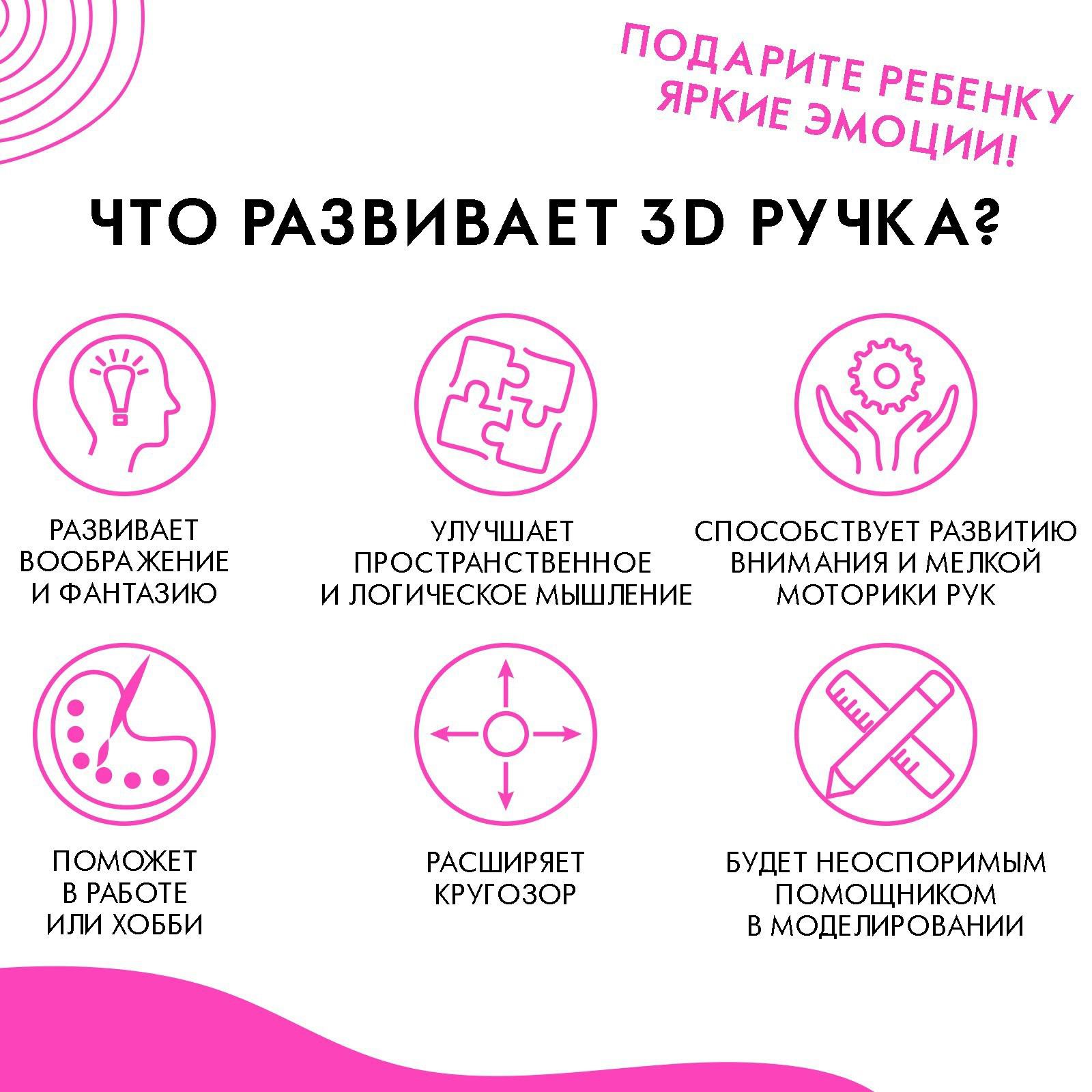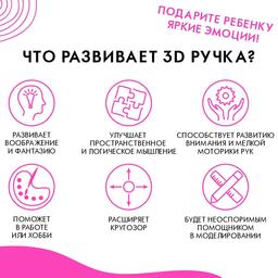 3D ручка с набором пластика и трафаретами — замечательный подарок ребёнку на любой праздник! Прекрасно развивает творческое мышление и увлекает полезной и безопасной игрой.