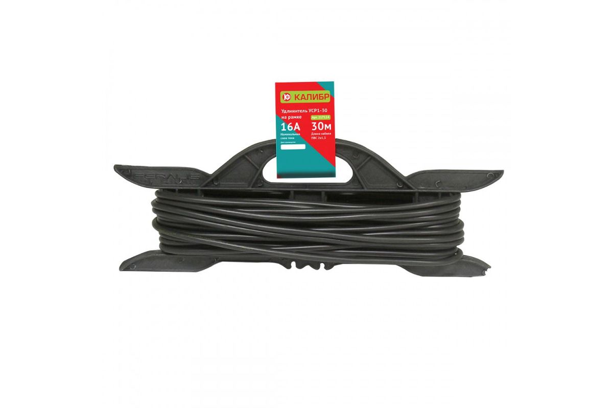 Удлинитель электрический ''Калибр УСР-30'' на рамке, предназначен для работы в сетях переменного тока напряжением 230±10%, ~50 Гц.