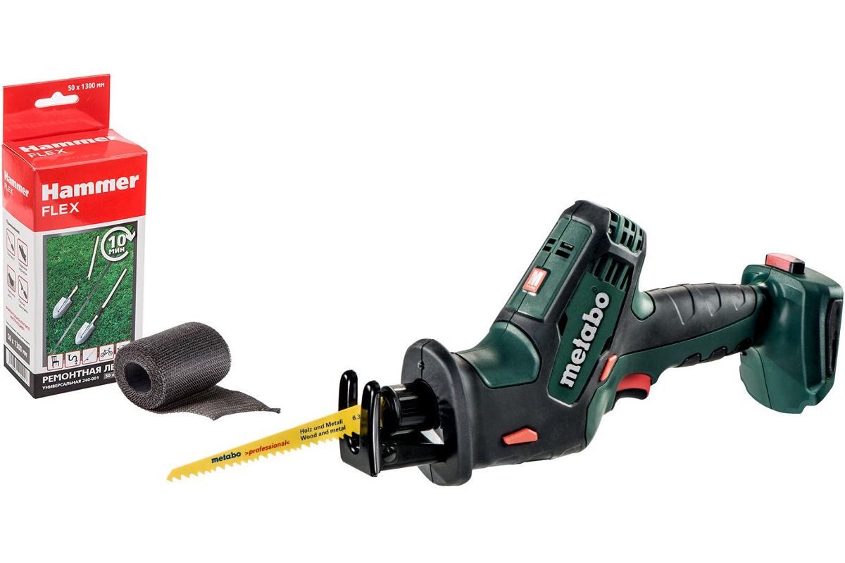 В состав набора входят: Ножовки METABO SSE 18 LTX Compact кейс (602266500) 18В 2х2.0Ач Li-ion кейс 602266500, Ремонтная лента Hammer Flex 240-001 универсальная