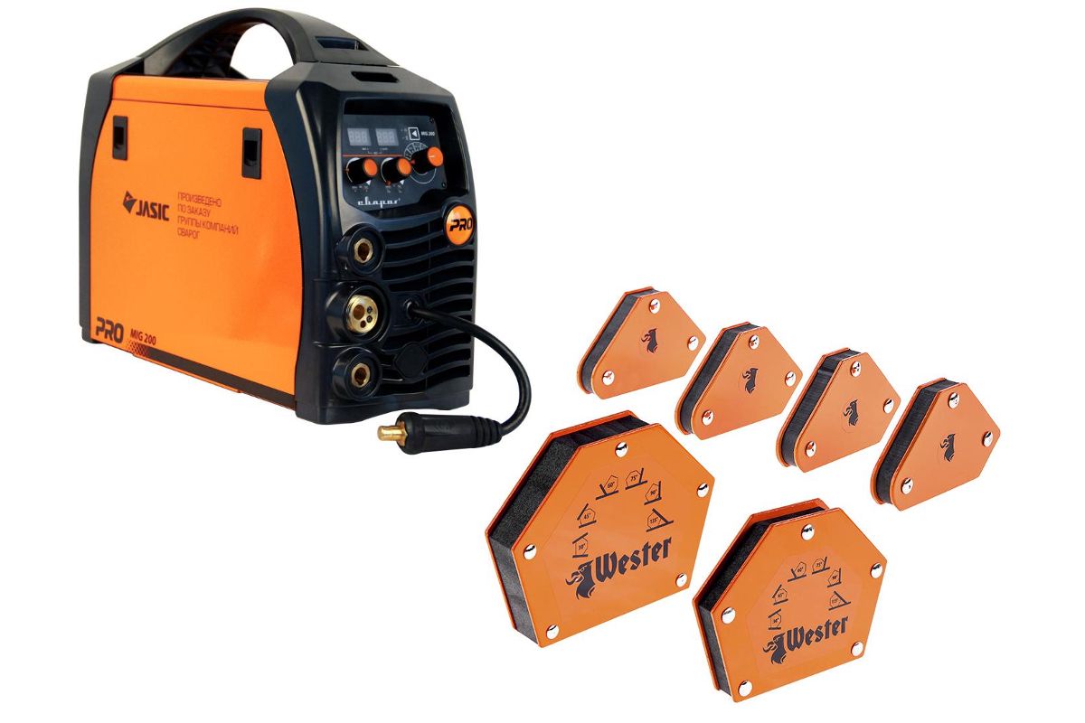 В состав набора входят: Сварочный аппарат СВАРОГ MIG 200 PRO N229 MIG/MAG/FCAW, Уголки магнитные для сварки WESTER MCS (4 шт.) 829-001, углы 45°, 90°, 135°, 5кг, Уголок магнитный для сварки WESTER WMCT50 829-006, углы 30°, 45°, 60°, 75°, 90°, 135°, 23кг, Уголок магнитный для сварки WESTER WMCT75 829-007, углы 30°, 45°, 60°, 75°, 90°, 135°, 35кг