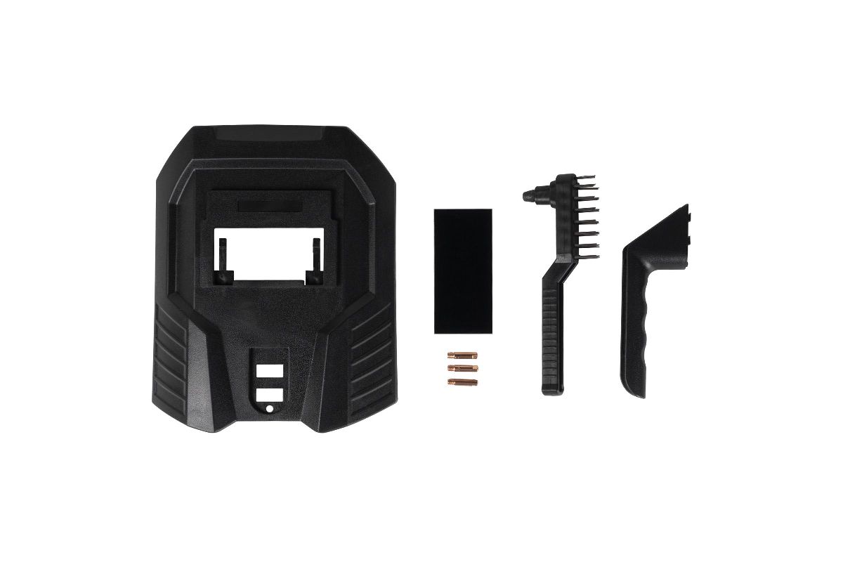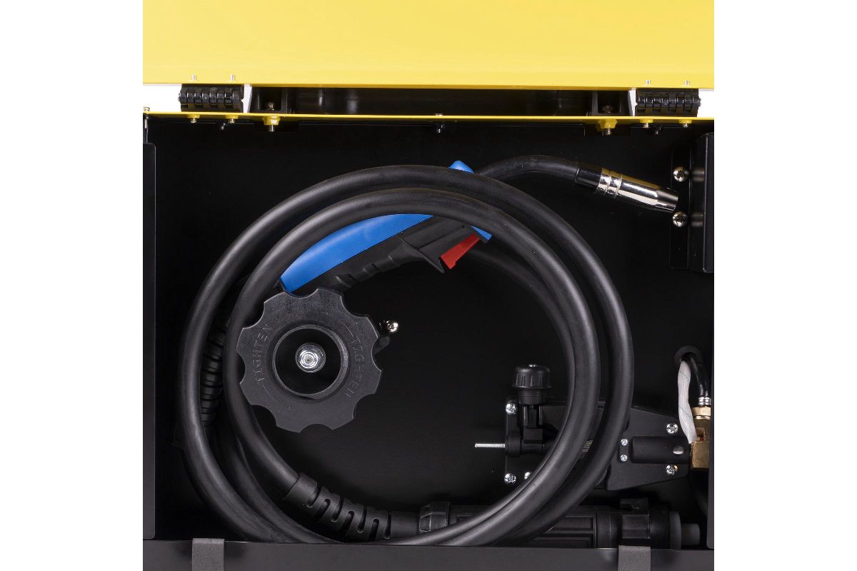 - Комплектация: рабочий кабель ММА с держателем электродов, рабочий кабель для MIG/MAG сварки со сварочной горелкой, кабель заземления с клеммой, контактор 3 шт. (0,6, 0,8 и 1,0 мм), наплечный ремень;