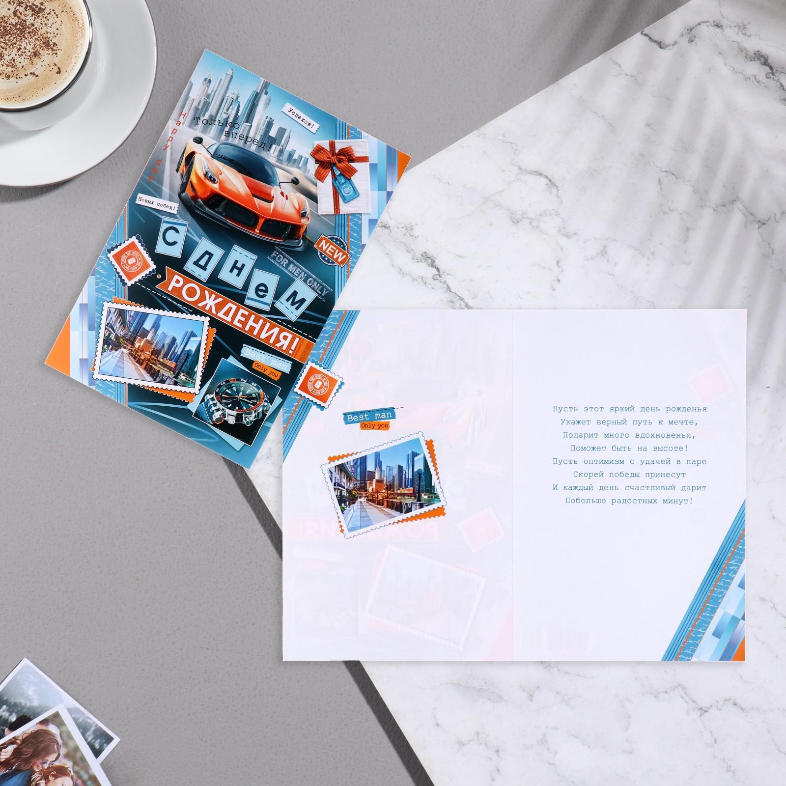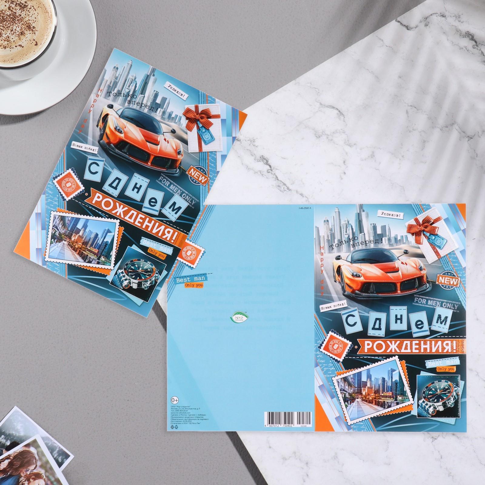 Открытка "С Днём рождения!" машина, часы, город, 19х29 см