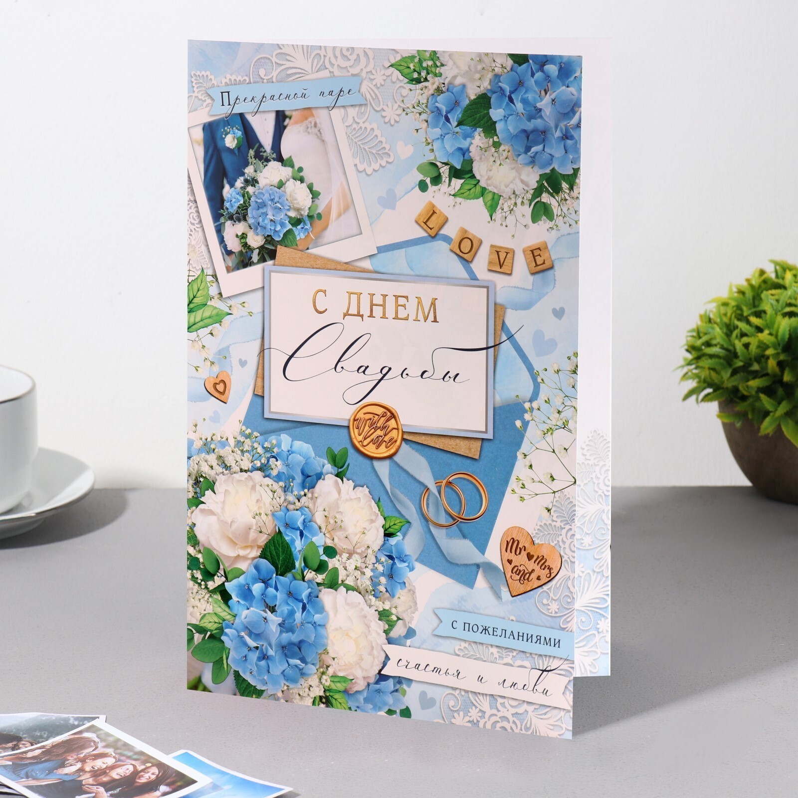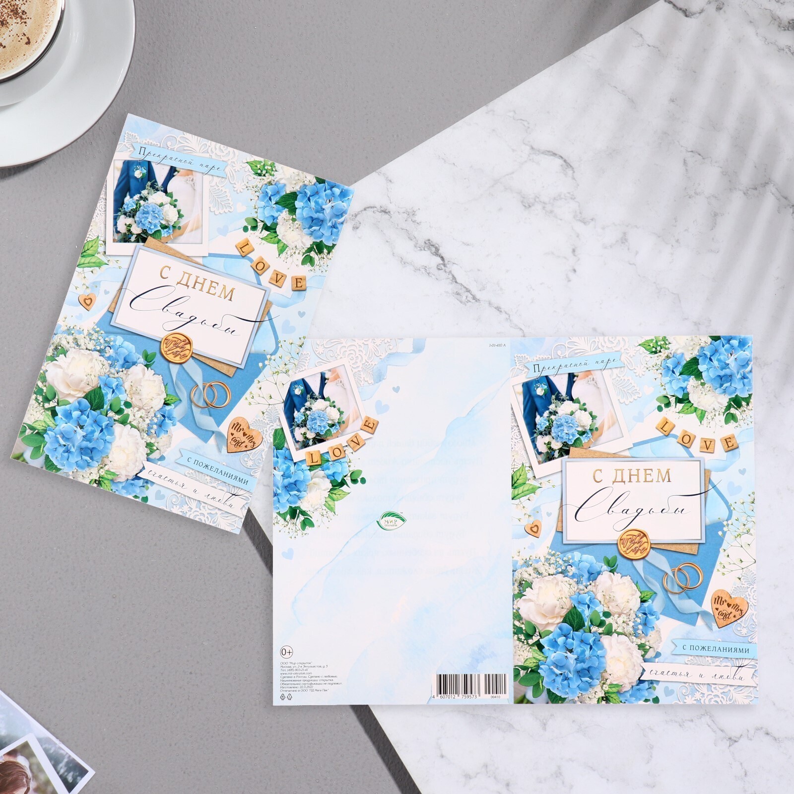 Открытка "С Днём Свадьбы!" голубые тона, цветы, печать, 37,9х16 см