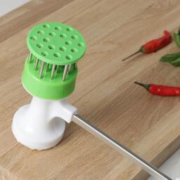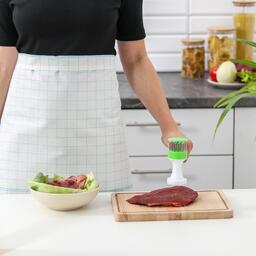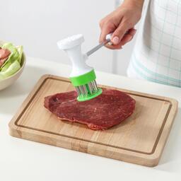 Мясо одновременно прокалывается несколькими острыми ножами по всей своей площади. Благодаря этому оно становится мягче и нежней, рассол и специи лучше проникают между волокон. Тепловые волны легче проходят сквозь ткани разрыхлённого продукта, и мясо прожаривается намного быстрее и равномернее.
