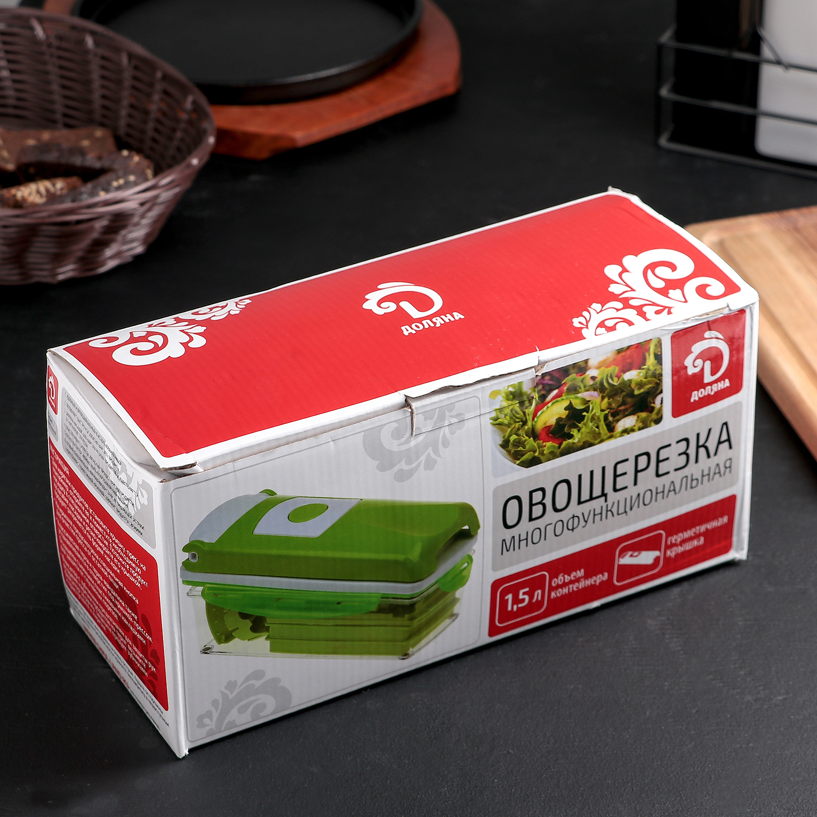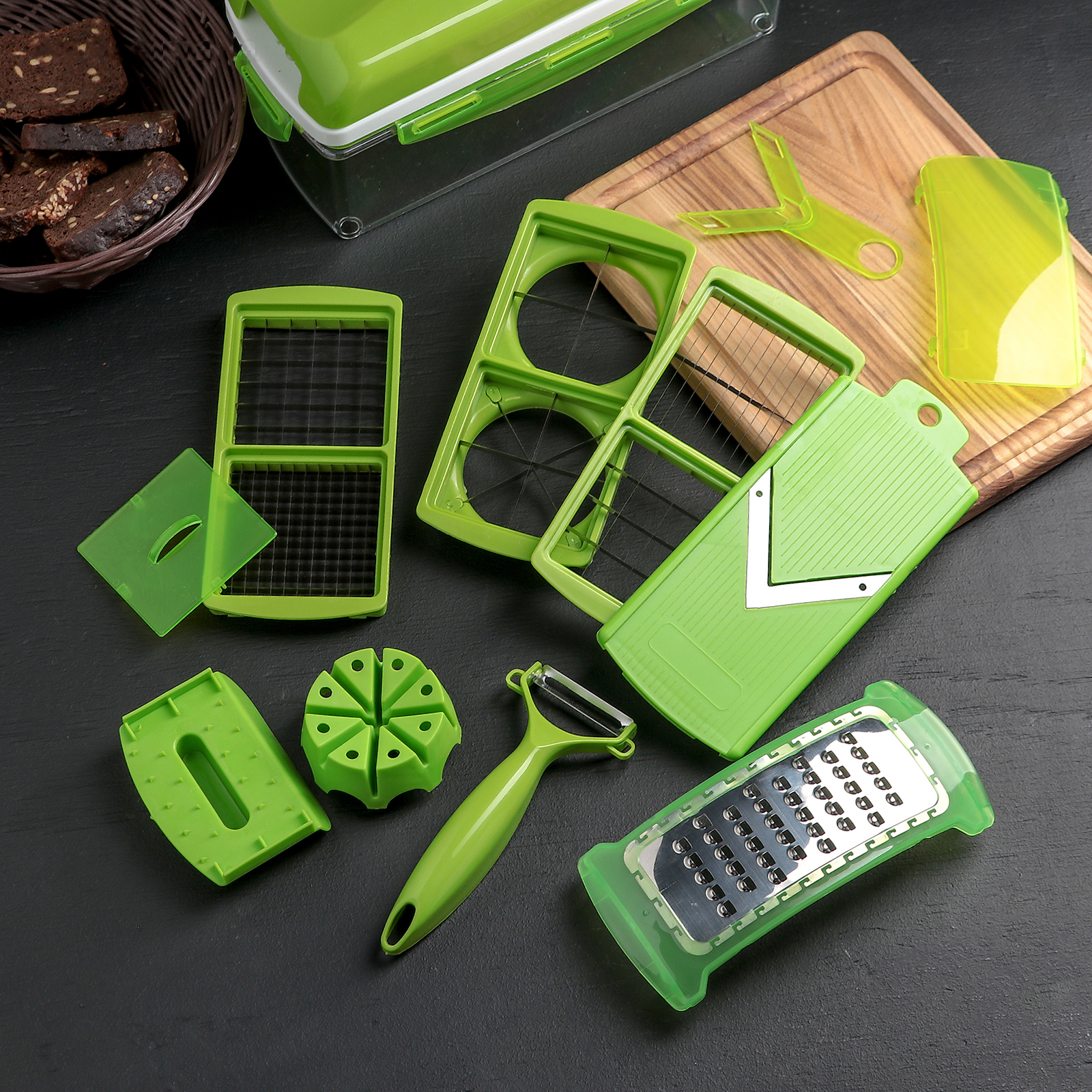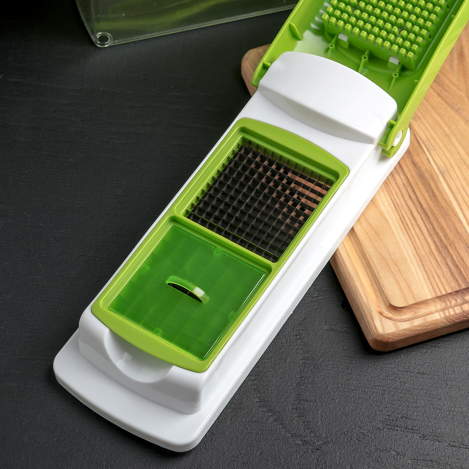Экономьте свои время и силы: специальные лезвия помогут быстро накрошить салат из овощей, фрукты для торта и многое другое. Тёрка с лотком Доляна «Фреш Флеш», 7 насадок, 27×10×12 см, цвет зелёный, белый быстро и безопасно мыть. Благодаря особой конструкции частички пищи не застревают и спокойно вымываются струёй тёплой воды.