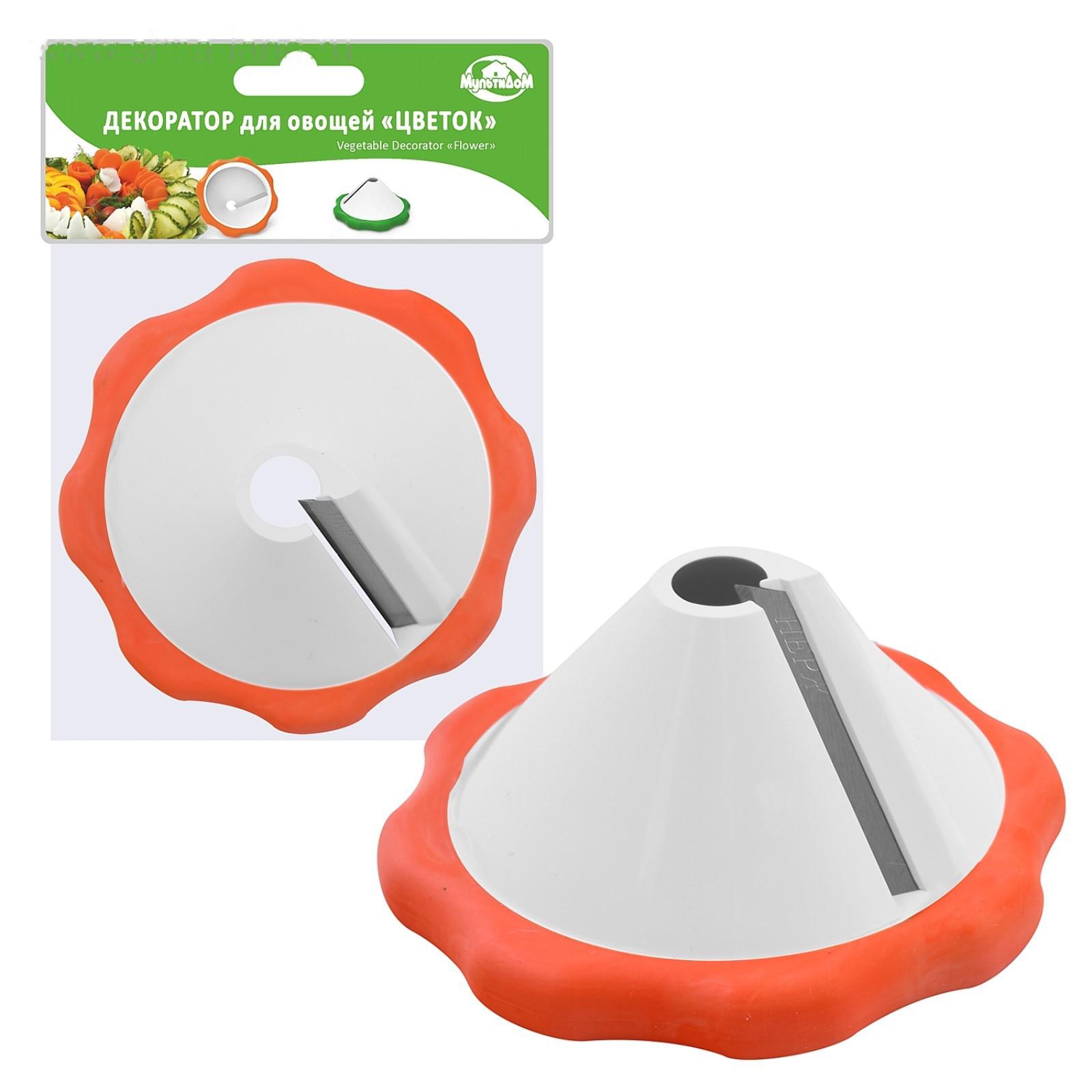 Декоратор для овощей устроен по принципу точилки для карандаша. В пластиковый корпус встроено острое лезвие, а углубление в виде воронки обеспечивает плотное прилегание овоща к режущему краю.