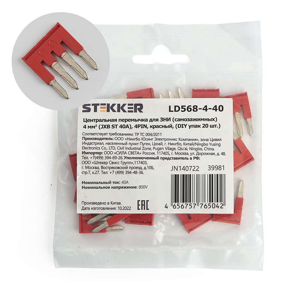Центральная перемычка для ЗНИ самозажимных 4 мм² (JXB ST 4) 4PIN LD568-4-40 (DIY упак 20 шт),STEKKER 39981