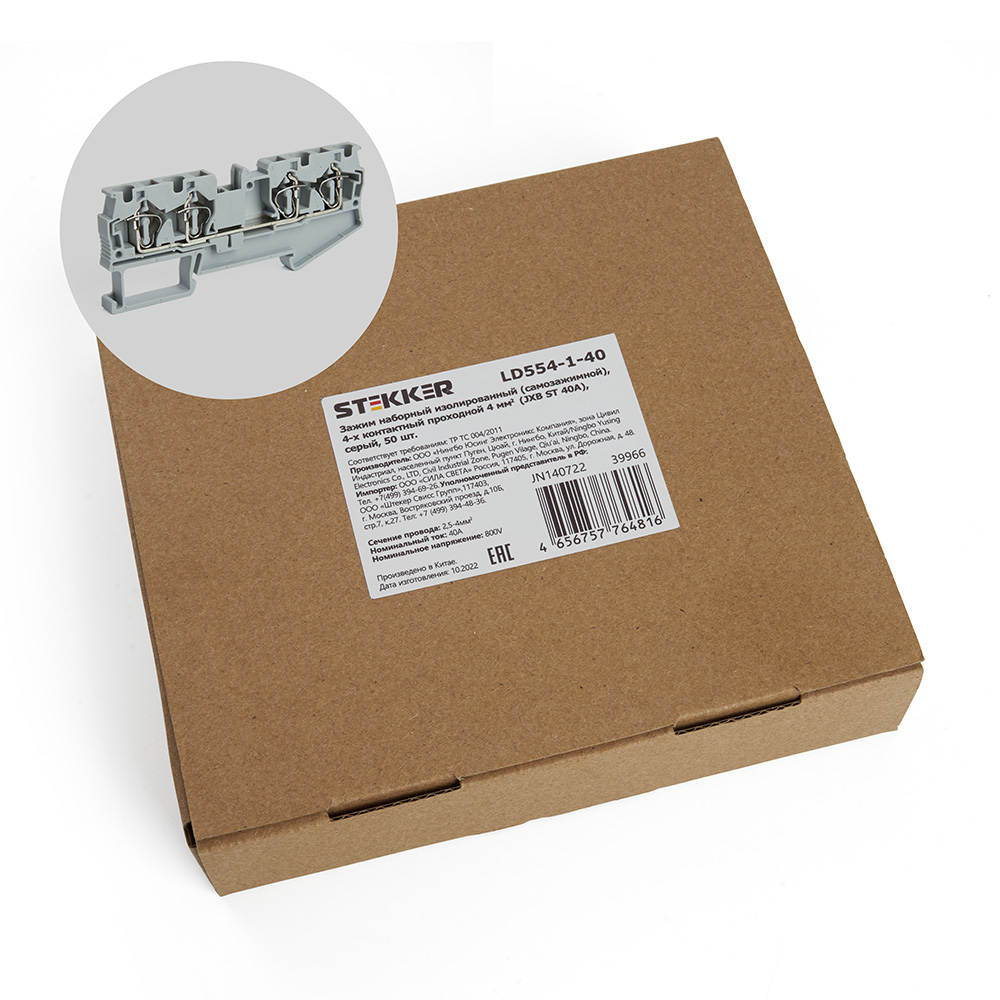 Зажим пружинный, 4-проводной проходной ЗНИ - 4,0 (JXB ST 4), серый STEKKER 39966