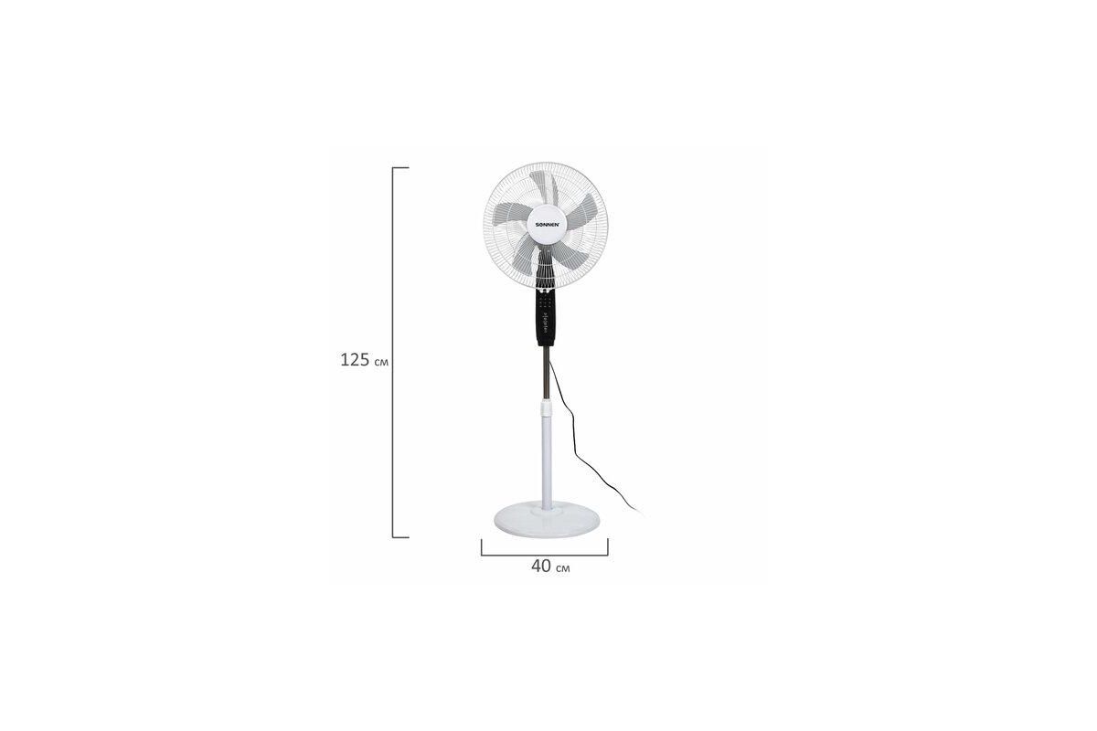 Вентилятор SONNEN TF-45W-40-520 напольного типа привлекает внимание устойчивой конструкцией и стильным черно-белым дизайном элегантного корпуса из металла и пластика.