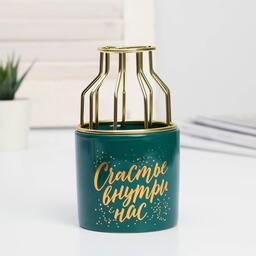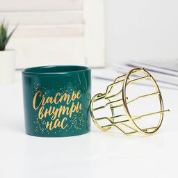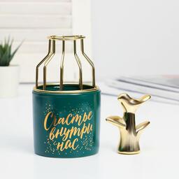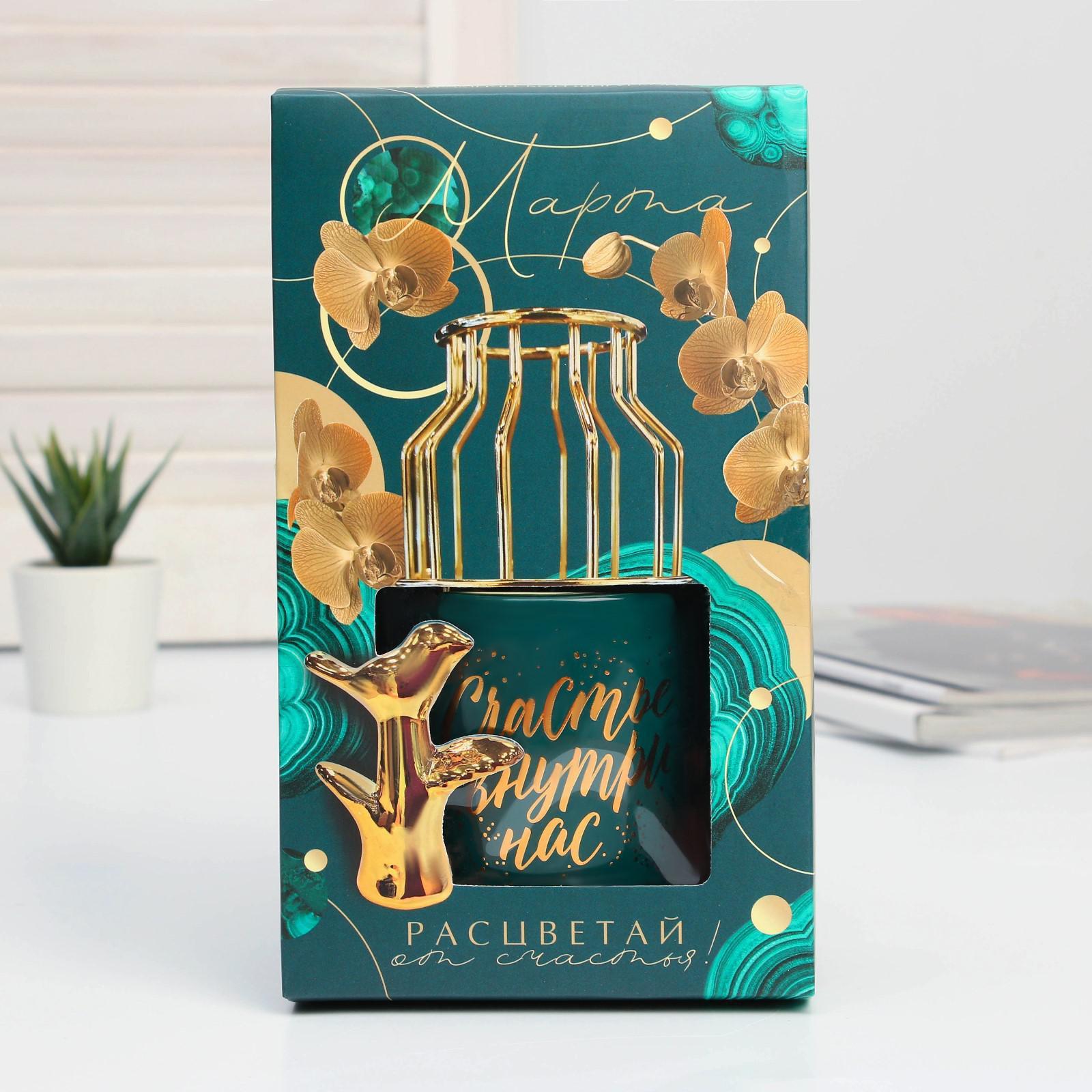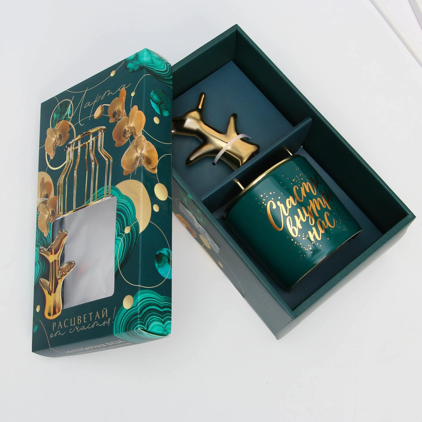 Подарочный набор станет отличным подарком на Новый Год, Рождество, Пасху, 14 февраля, 8 марта или День Рождения. Ваза для цветов состоит из двух частей: керамической и металлической. На керамическую часть нанесен красивый золотистый рисунок, который выполнен в технике деколь. Металлическую часть вазы можно легко снять и поставить в нее сухоцветы, а керамическую использовать в качестве миниатюрного горшка или стакана. Золотистая фигурка выполнена из керамики, которая окрашена золотой краской. Набор надежно упакован в картонную подарочную коробку с эксклюзивным дизайном.