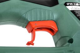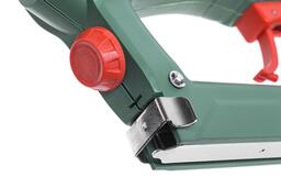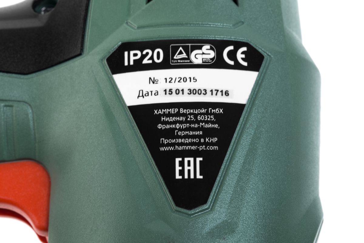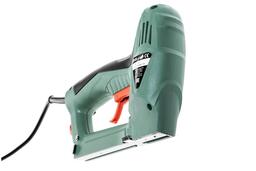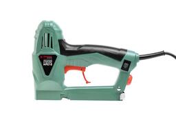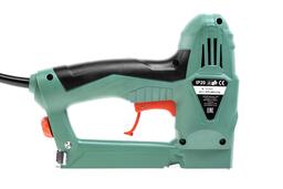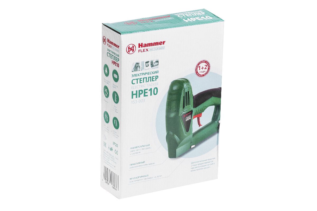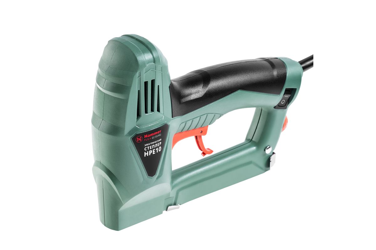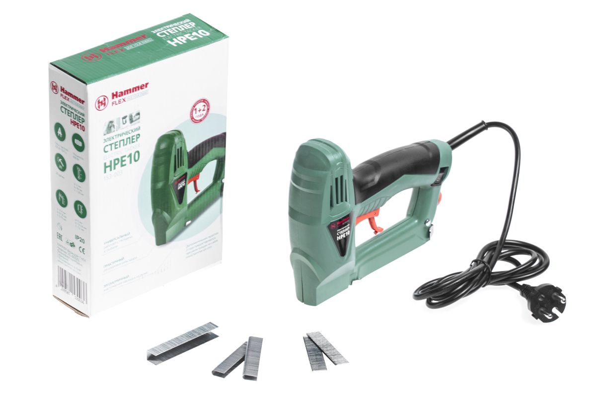 HAMMER HPE10 — бытовой электрический степлер с питанием от сети. Потребляет 650 Вт. С его помощью можно крепить фанеру, гипсокартон, сетку, ткани к деревянному основанию. Из оснастки используются гвозди, а также U-образные и П-образные скобы. Отличается емким магазином, хорошей производительностью (20 уд/мин) и удобной рукояткой. Силу удара можно регулировать.