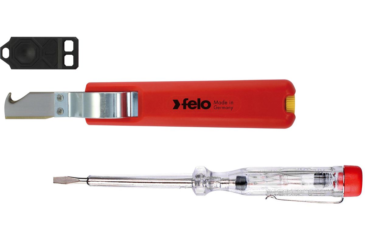 В состав набора входят: Нож FELO 58401811 для снятия изоляции, Отвертка FELO 36130000 тестер напряжения 3.0x0.8x65 220-250 в Нож для снятия изоляции предназначен для работы под напряжением до 1000 В.Инструмент исключает повреждение жилы. Ручка изготовлена из высококачественного материала, обеспечивающего отсутствие проскальзывания рук. Отвертка тестер напряжения используется для определения фазы в электрике, а также проверки напряжения. Изделие состоит из хром-молибден-ванадиевого стержня и пластикового корпуса, атакже световой индикатор. Данный тестер не требует дополнительного источника питания.