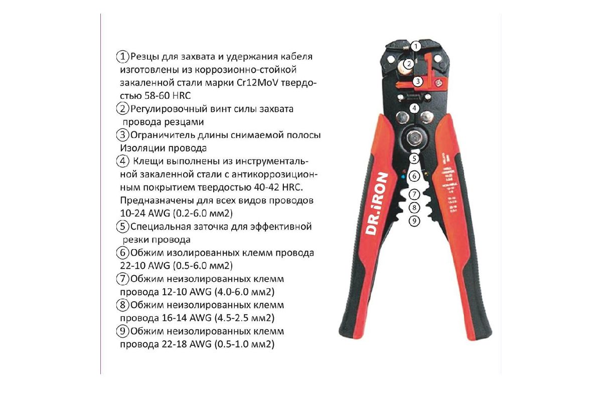 Клещи Dr. IRON DR6004 для снятия изоляции, обжима, резки провода 200мм, блистер