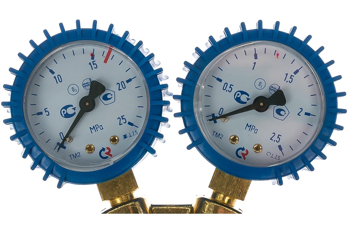 На редукторе установлены показывающие устройства: для определения давления в рабочей камере – на 1.25 МПа и для определения давления в баллоне – на 20 МПа. Оснастка присоединяется к баллону входным штуцером с помощью гайки с резьбой G3/4 по ГОСТ 6357-81. Отбор газа осуществляется через ниппель универсальный, к которому присоединяется рукав с внутренним диаметром 9 мм или 6.3 мм по ГОСТ 9356-75.