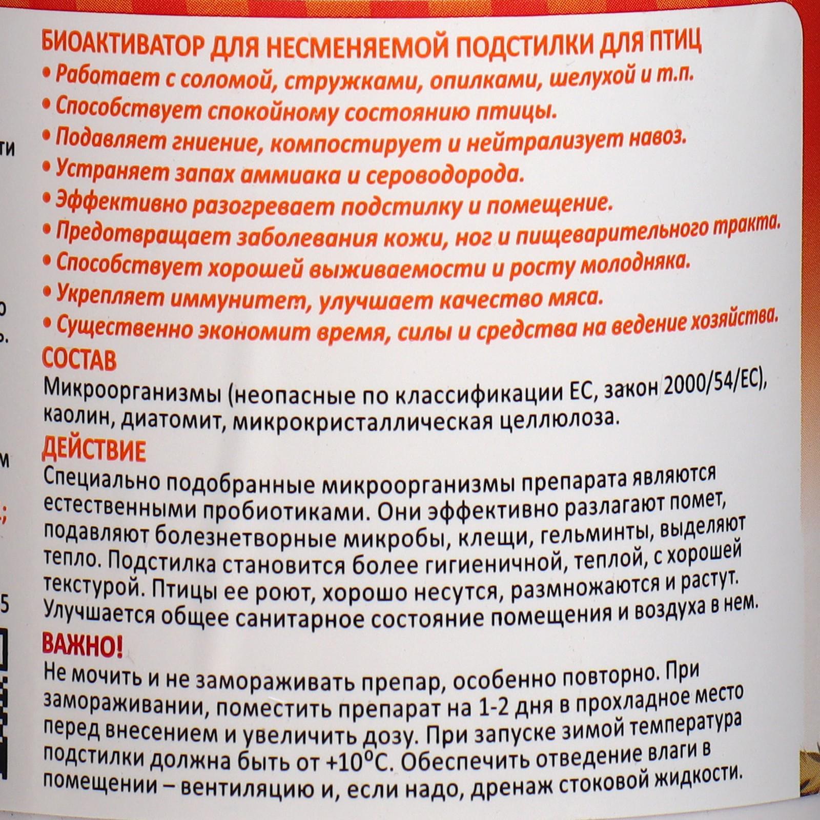 Препарат образует полезную микрофлору, вытесняет патогенные микроорганизмы, гниль, способствует здоровью домашней птицы. Устраняет запах, позволяет эффективно использовать подстилку в течение длительного времени.