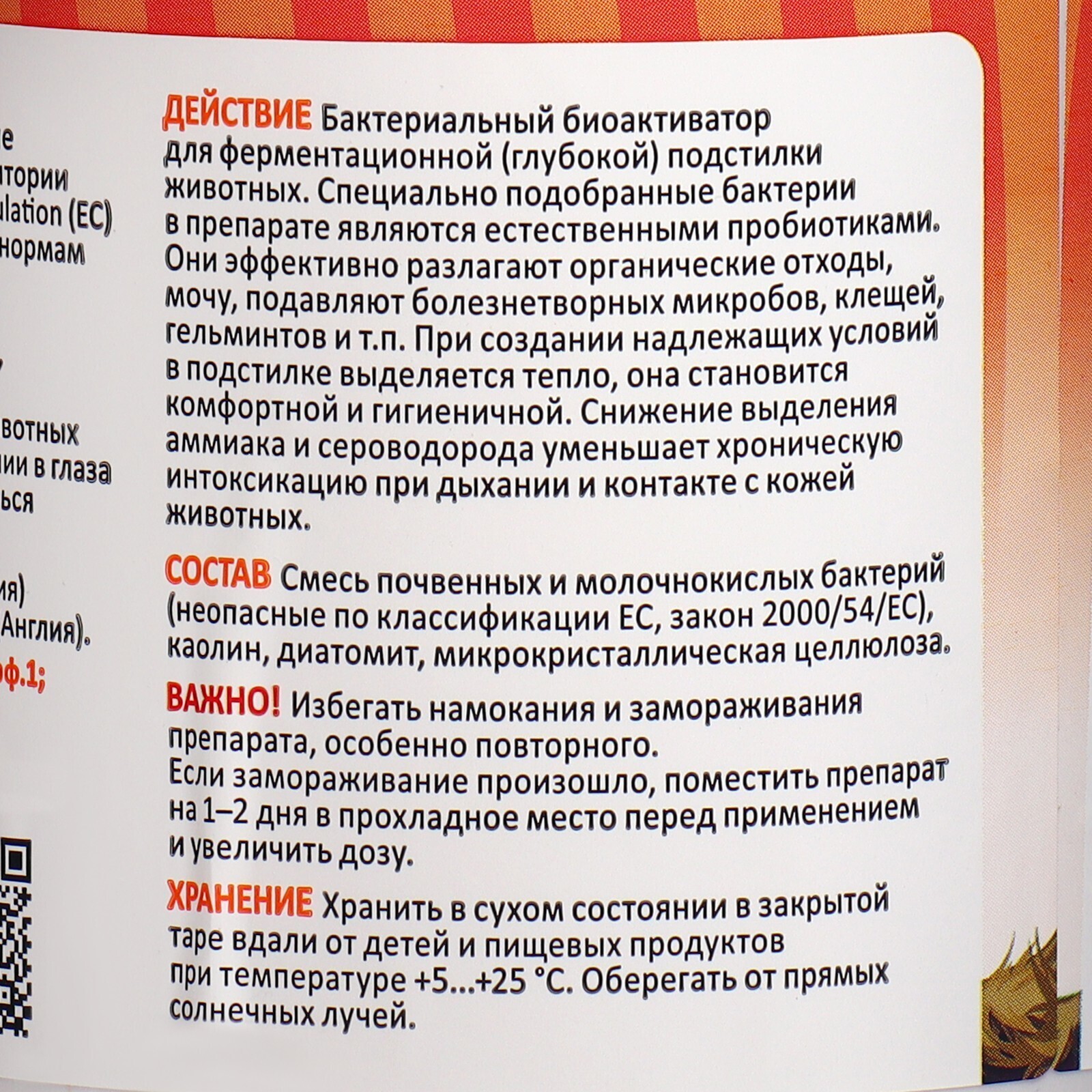 Бактериальный биоактиватор для ферментационной подстилки (глубокой). Специально подобранные бактерии в препарате являются естественными пробиотиками. Эффективно разлагая органические отходы животных, подавляют болезнетворных микробов, клещей, гельминтов и т.п.