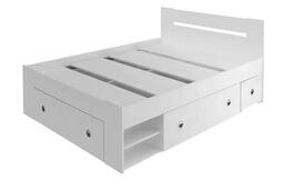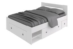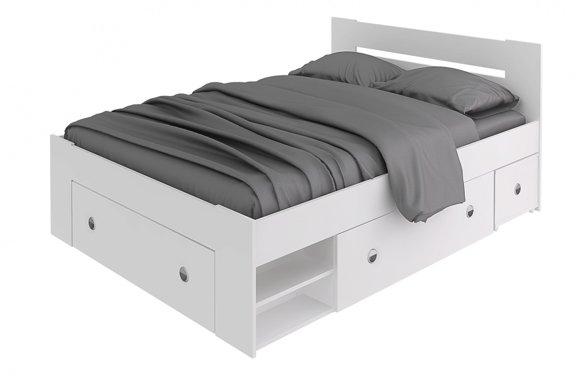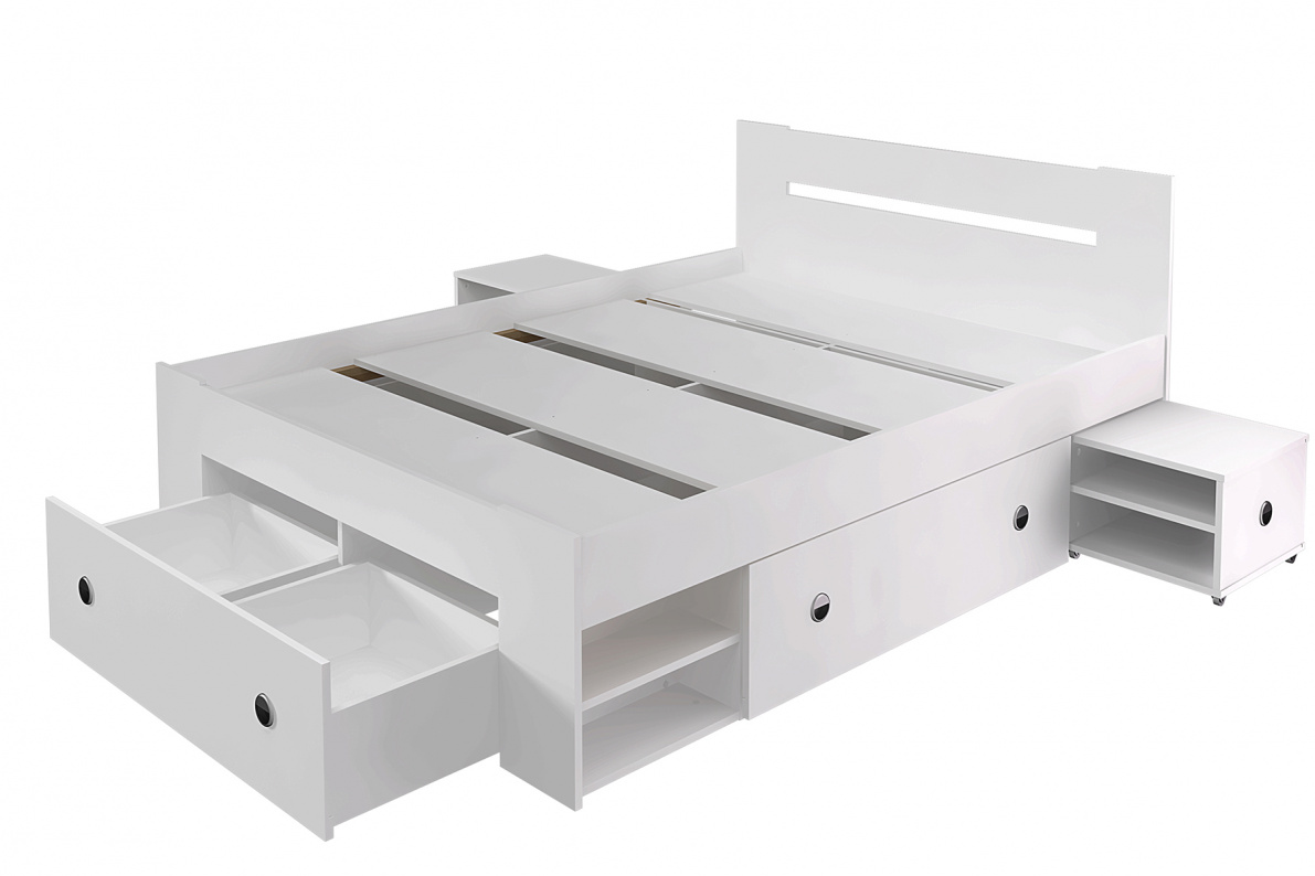 В комплекте: три ящика для белья на роликах, две выдвижные тумбы прикроватные. Основание для матраса – настил из ЛДСП. Матрас приобретается отдельно.