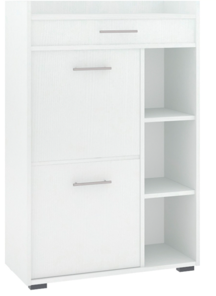 Тумба для обуви вмещает за закрытые фасадами полки до 8 пар обуви, что позволяет держать прихожую в чистоте, а обувь в быстром доступе. Имеет в своем составе открытые и закрытые полки, а также 1 выдвижной ящик.
