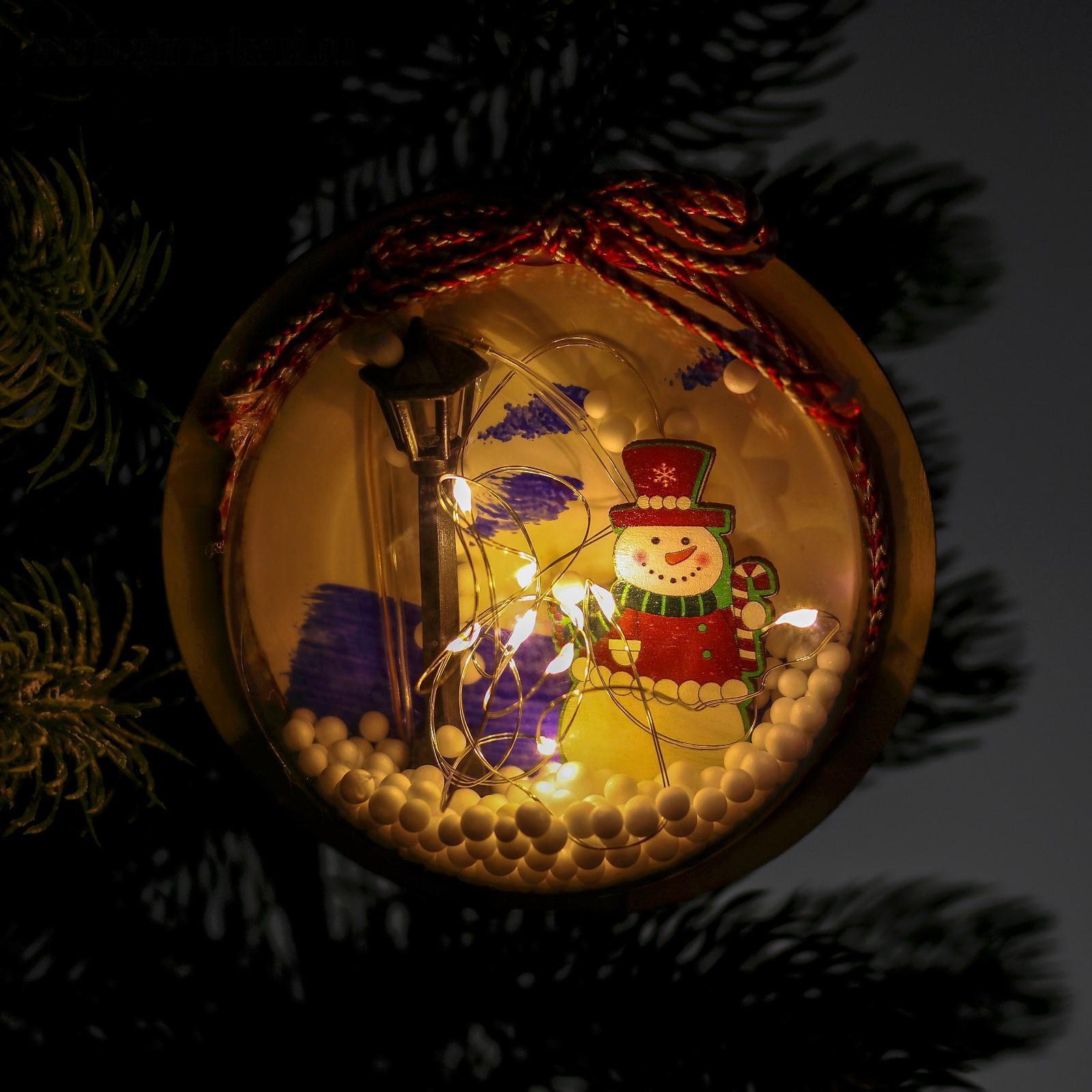 Новогодний шар с деревянной фигуркой и подсветкой «Снеговик и фонарь» 12х12 см