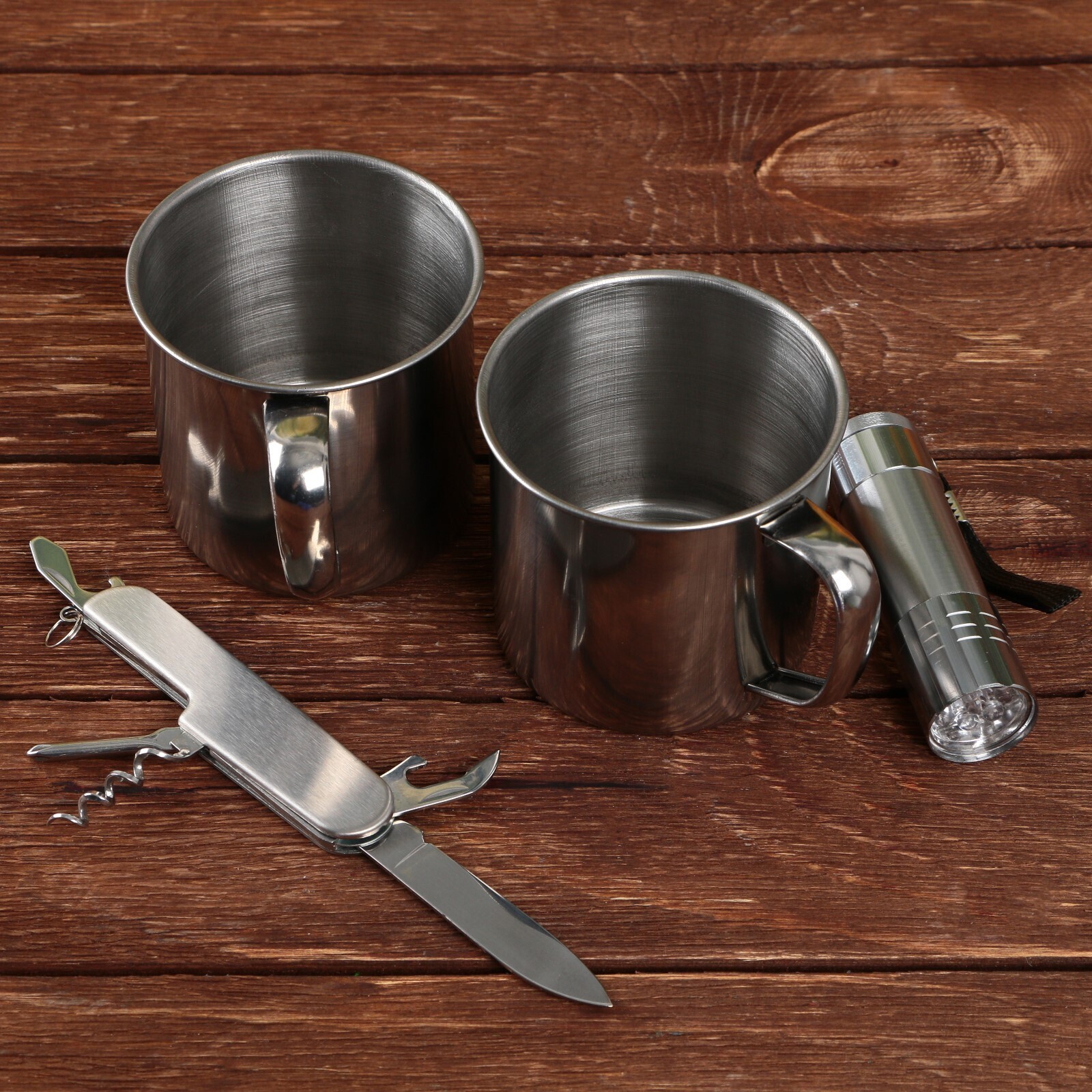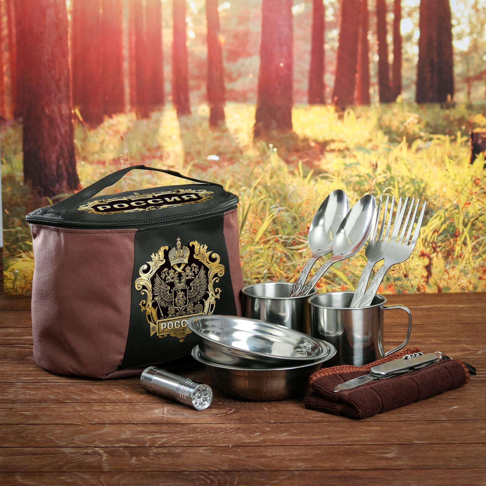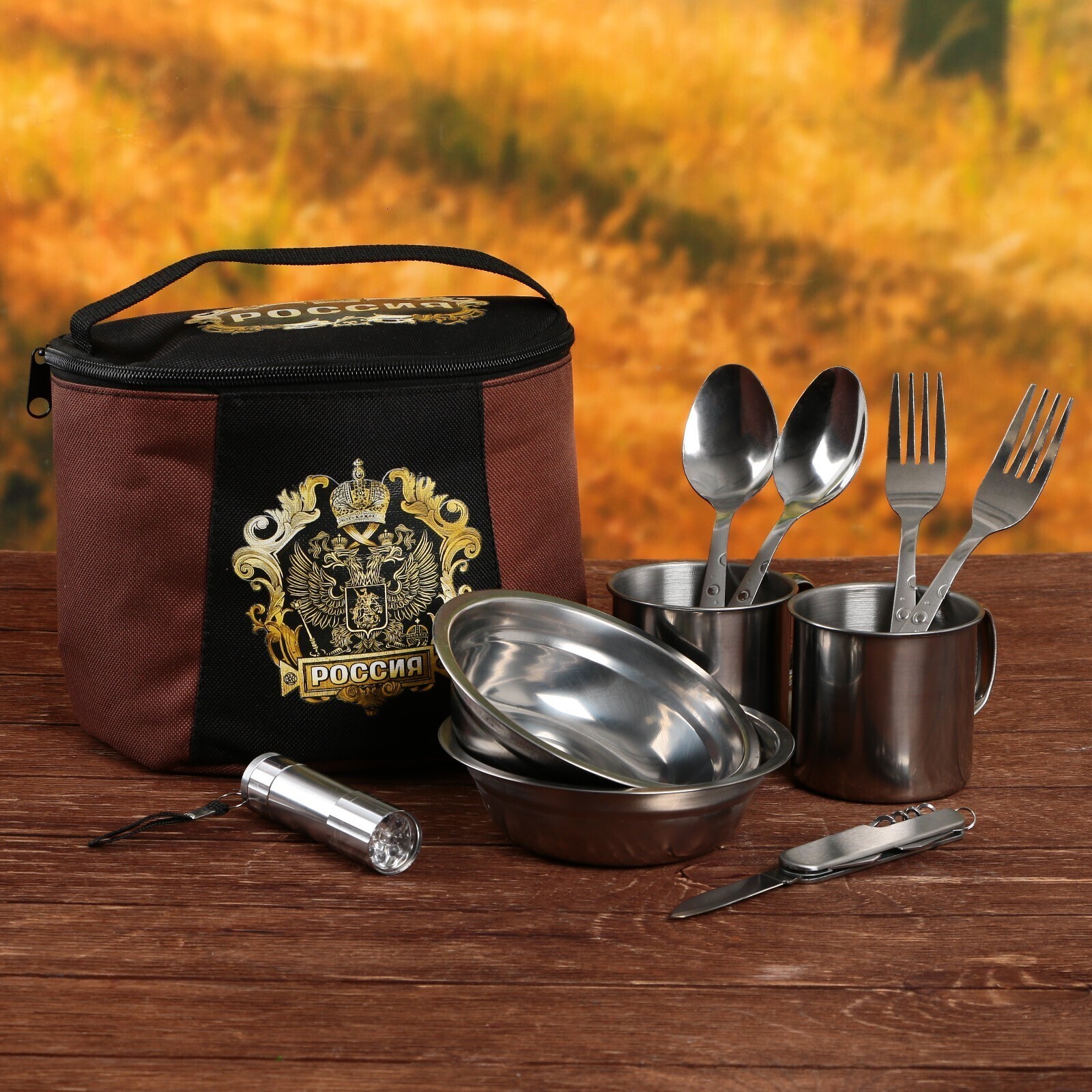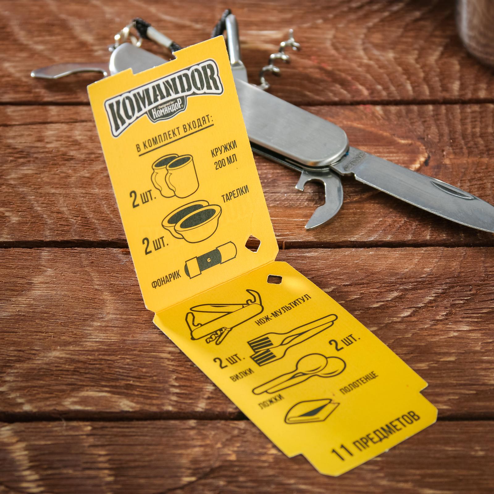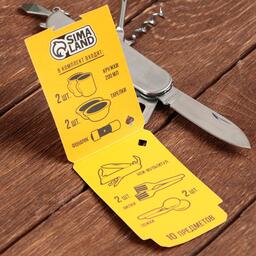 • Составляющие набора Вилка, Кружка, Ложка, Мультитул, Тарелка, Фонарик